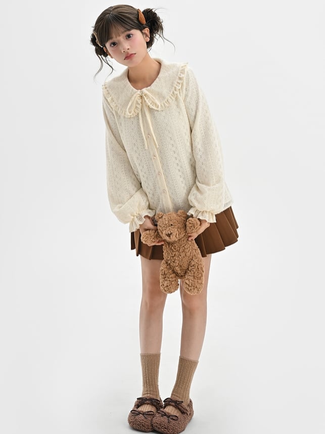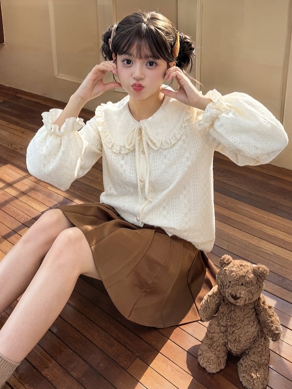 Aprikosenfarbene Spitzenbluse mit Peter-Pan-Kragen und Ballonärmeln