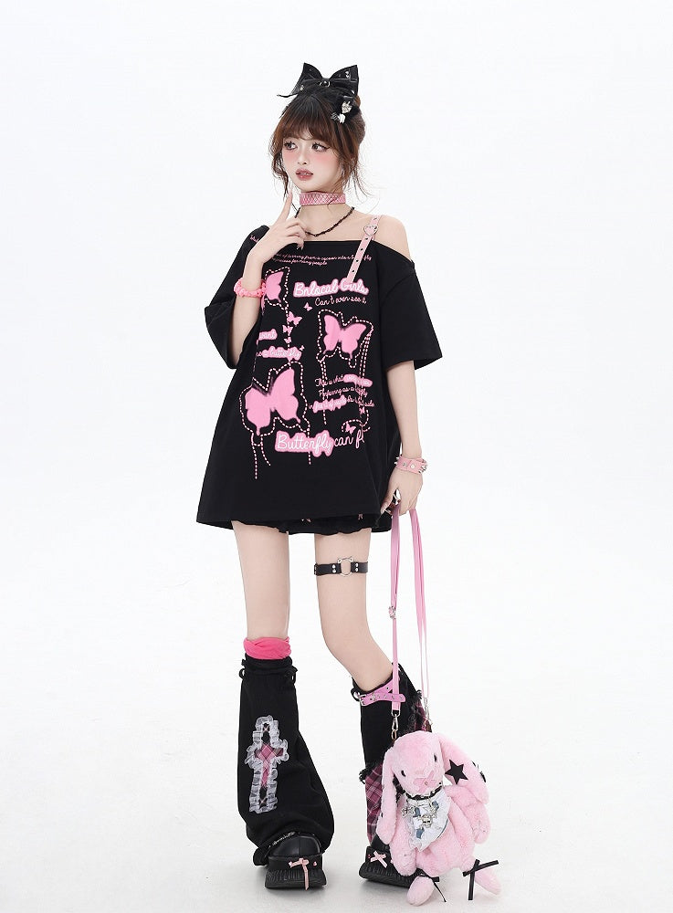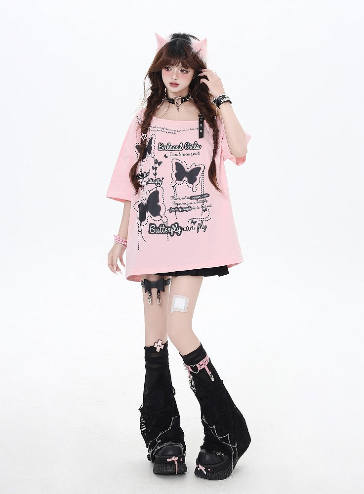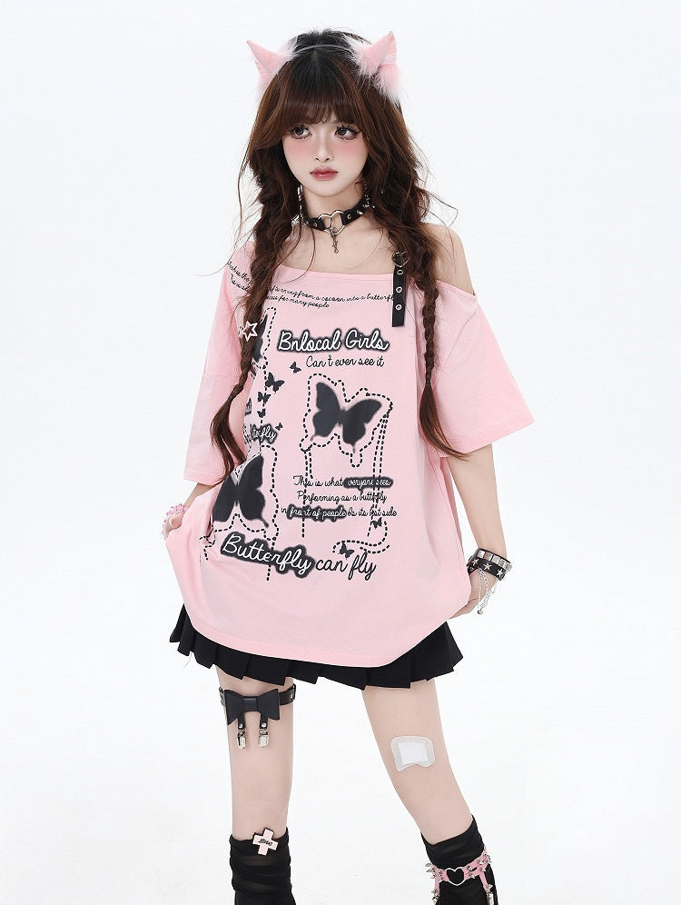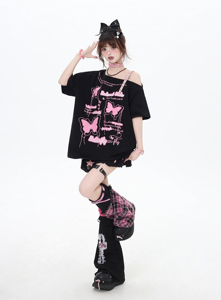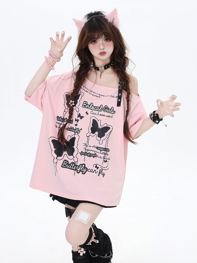 Asymmetrischer Ausschnitt Schmetterlingsdruck Herzschnalle Schwarz/Rosa Lockeres T-Shirt