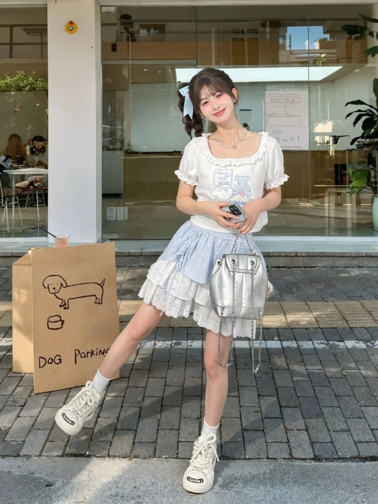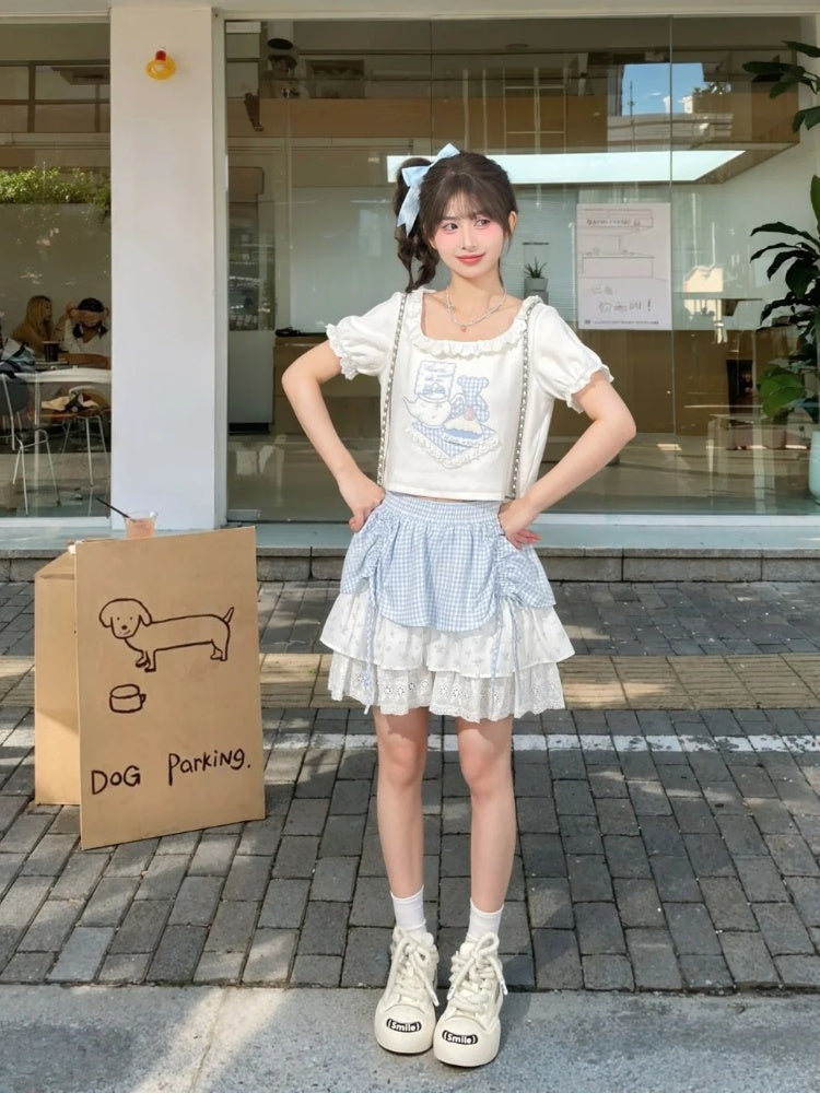 Weißes T-Shirt mit Bärenmuster, quadratischem Ausschnitt und Puffärmeln, Spitzenbesatz, Rüschenkaro