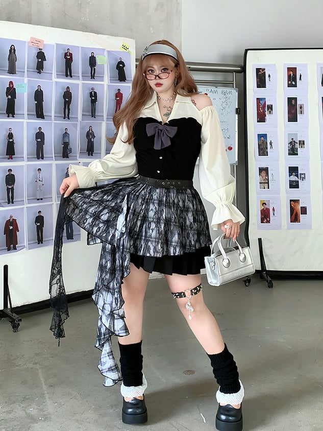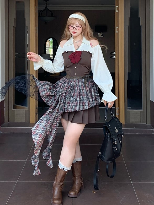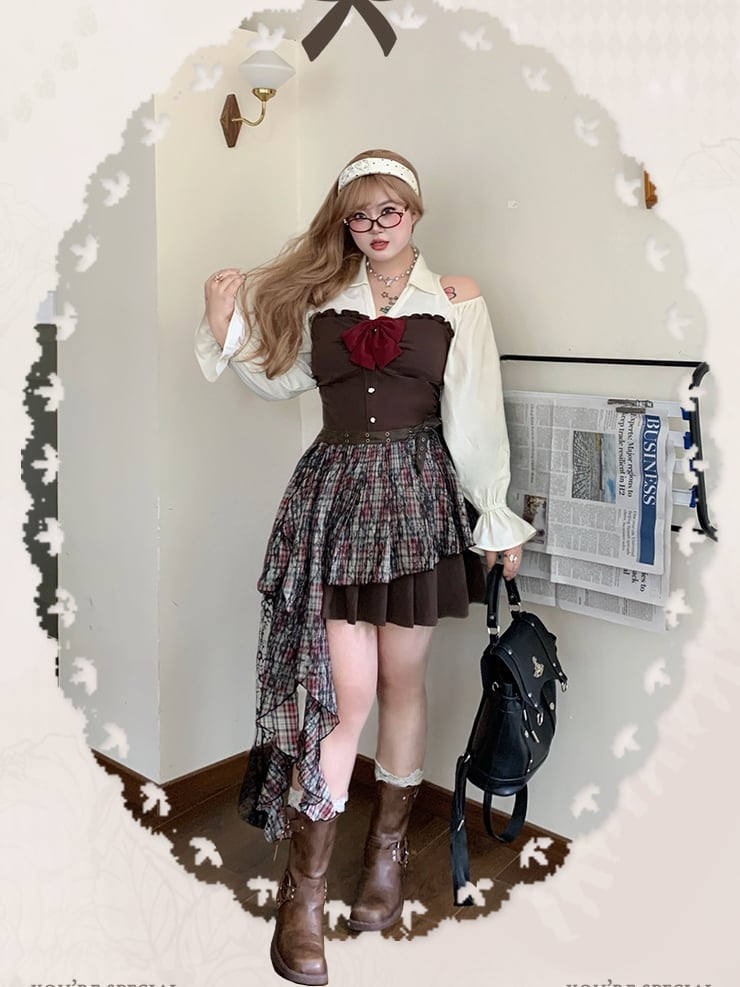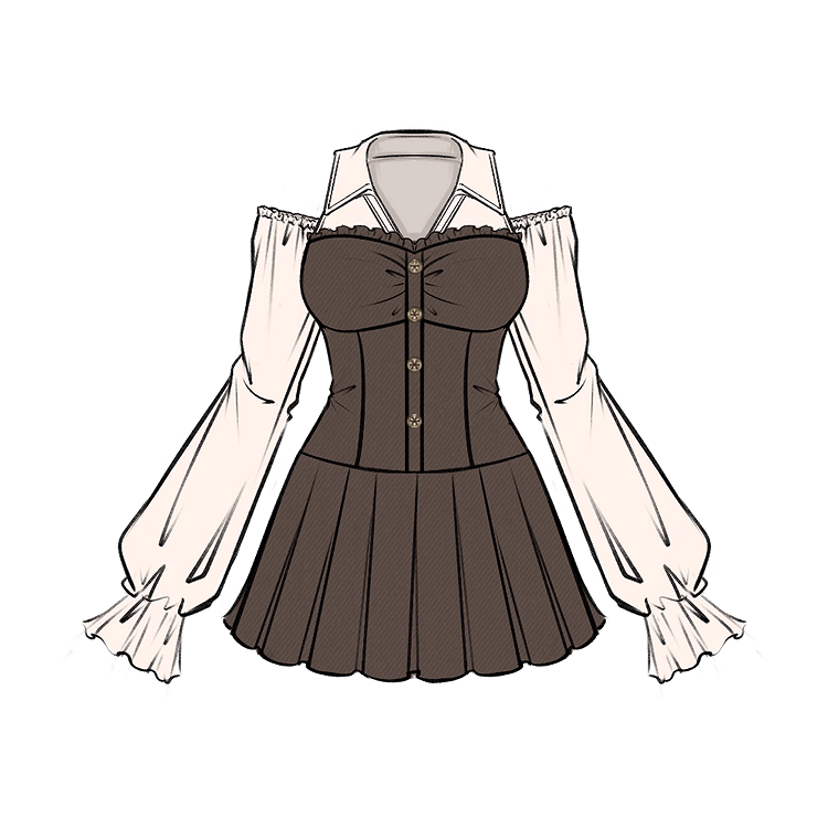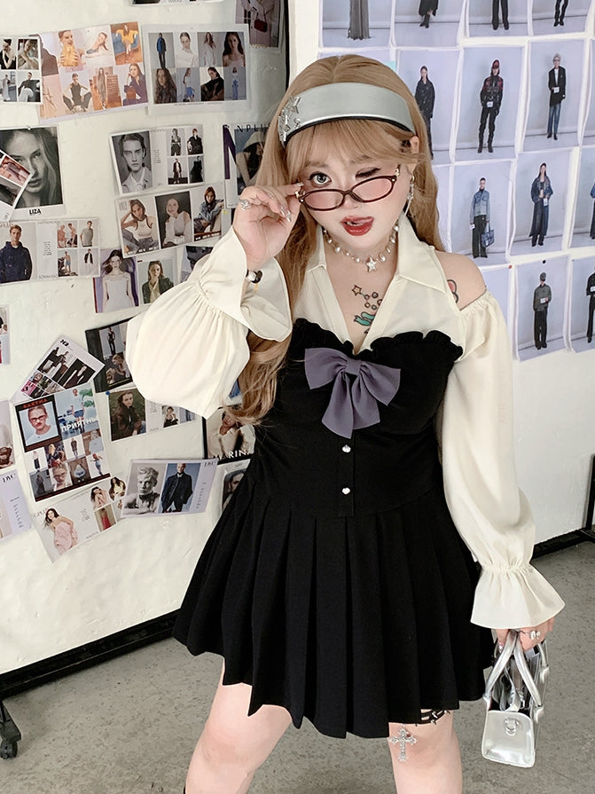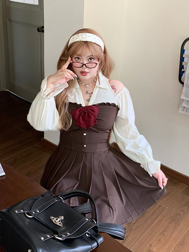 Plus Size Schwarz/Braun Kleid Faltenrock mit ausgeschnittenen Schultern und Bischofsärmeln