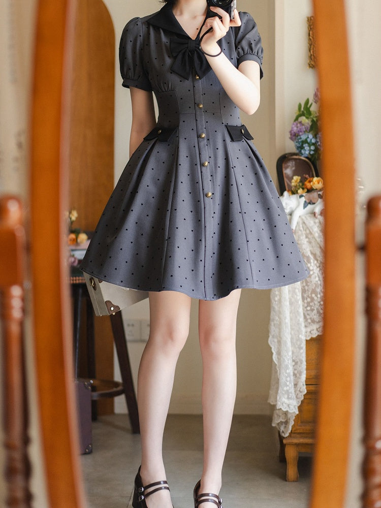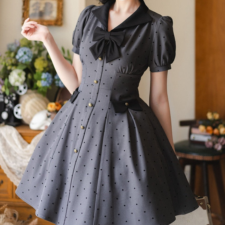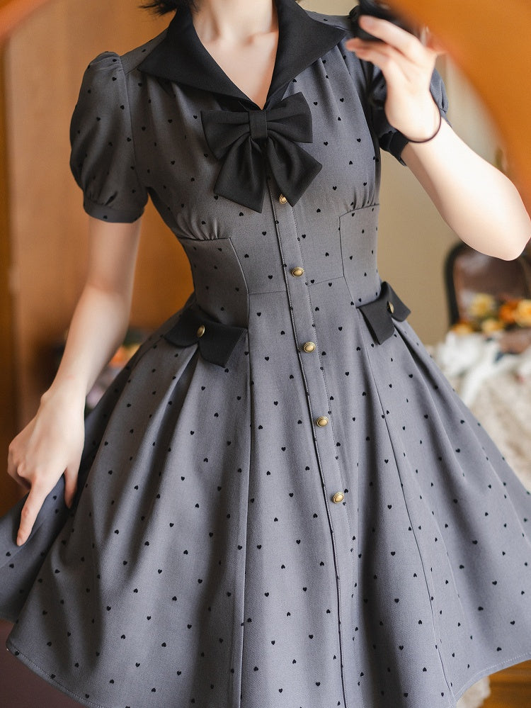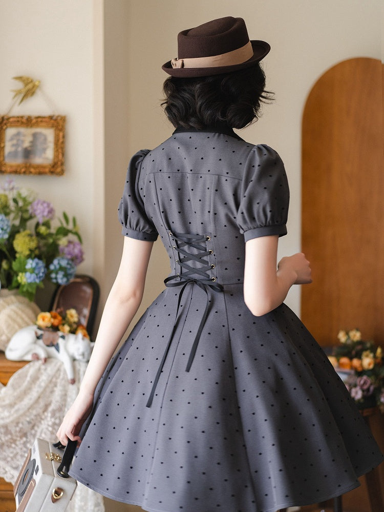 Retro-Mode Kleines Schwarzes Herzförmiges Muster Dunkelgraues Kleid Mit Puffärmeln