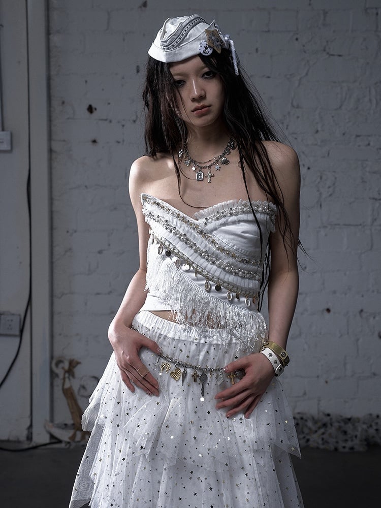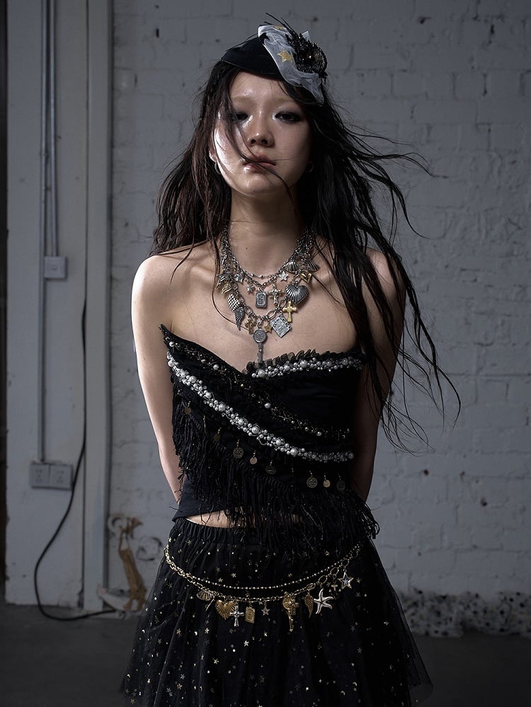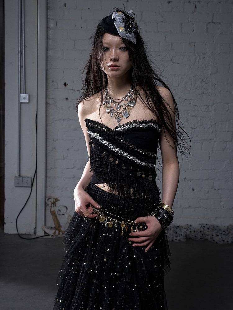 Trägerloses Top in Schwarz/Weiß mit Barockperlendetails und Fransensaum im Crossover-Design