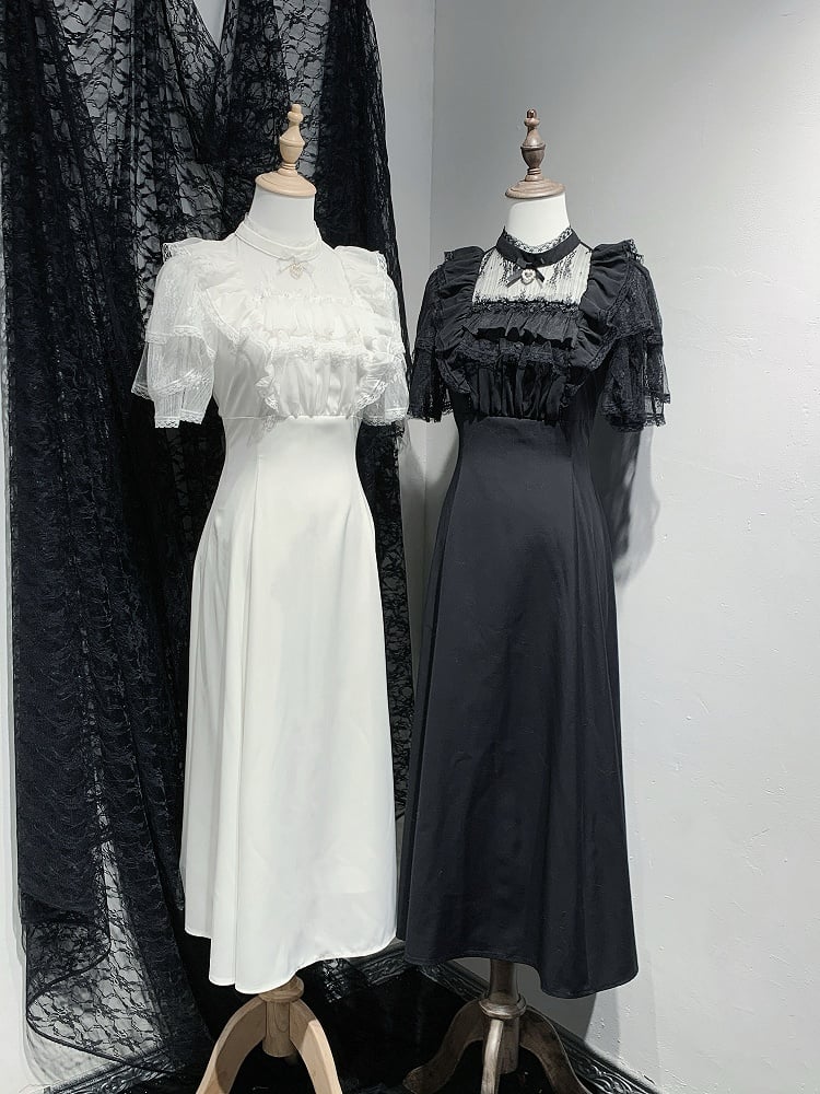 Schwarz/Weiße Spitze im hohen Ausschnitt mit Rüschen an der Taille, Kleidbesatz, Jirai Kei Illusion mit