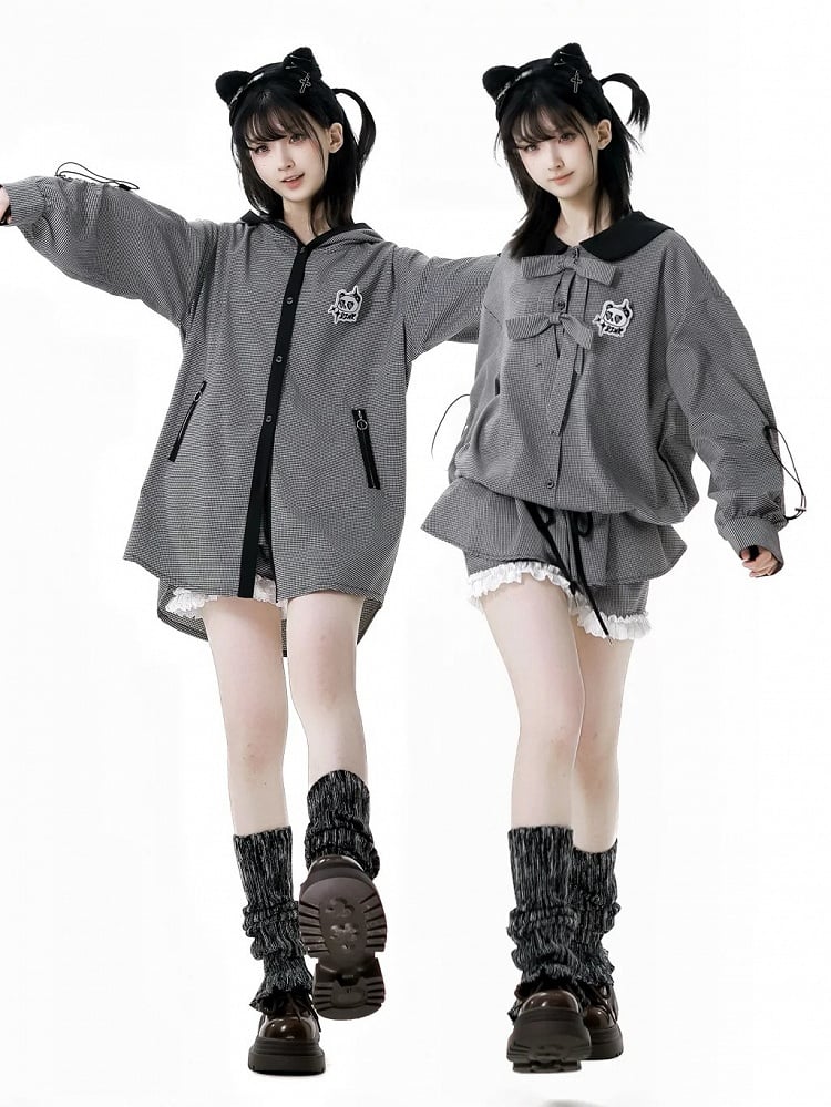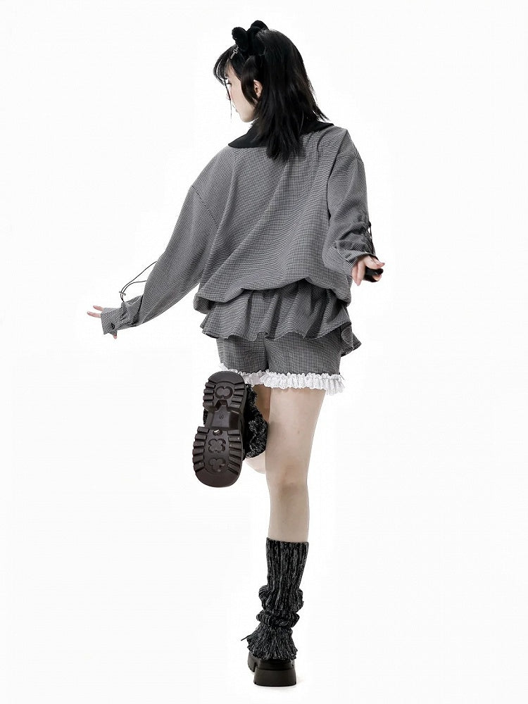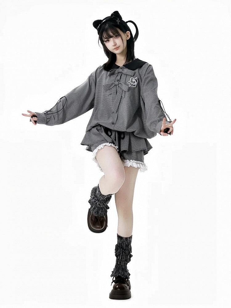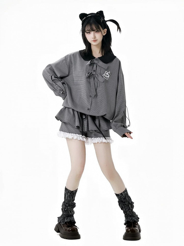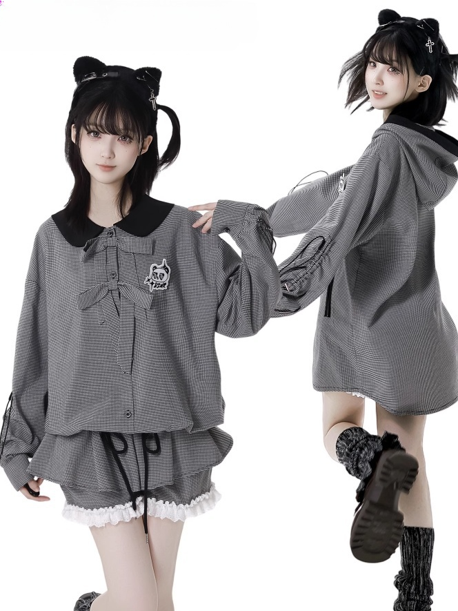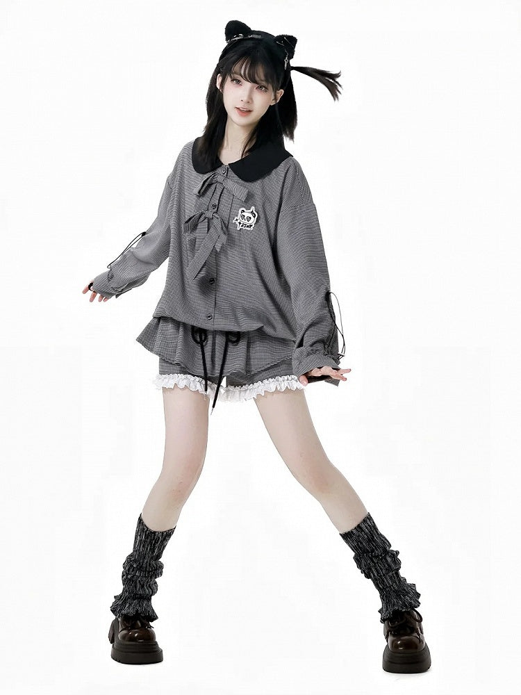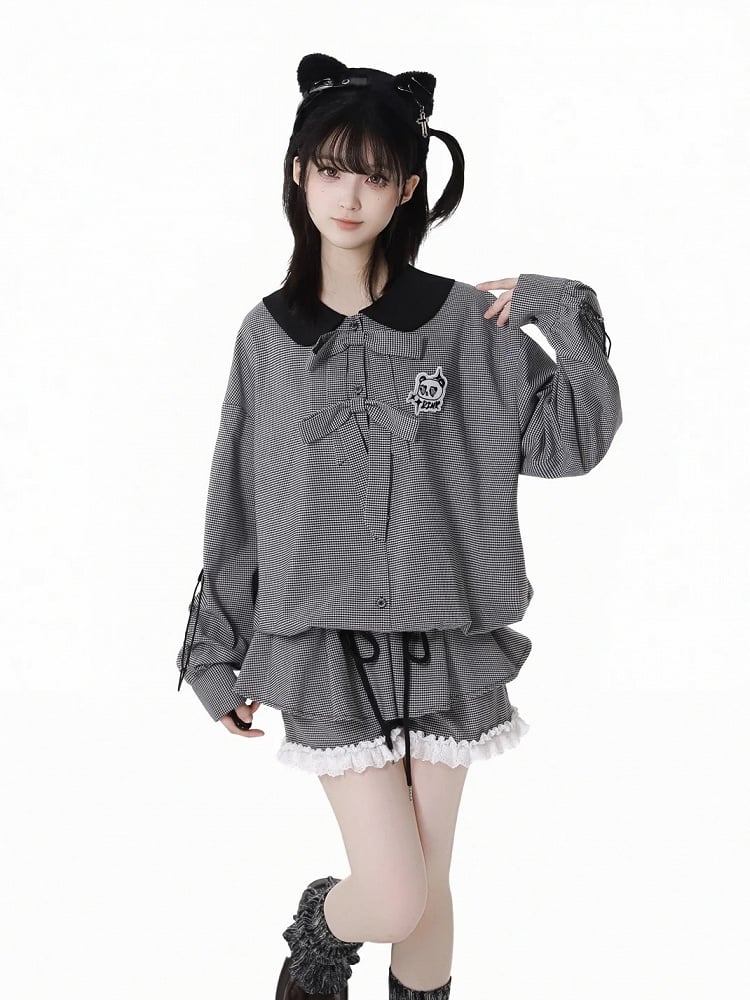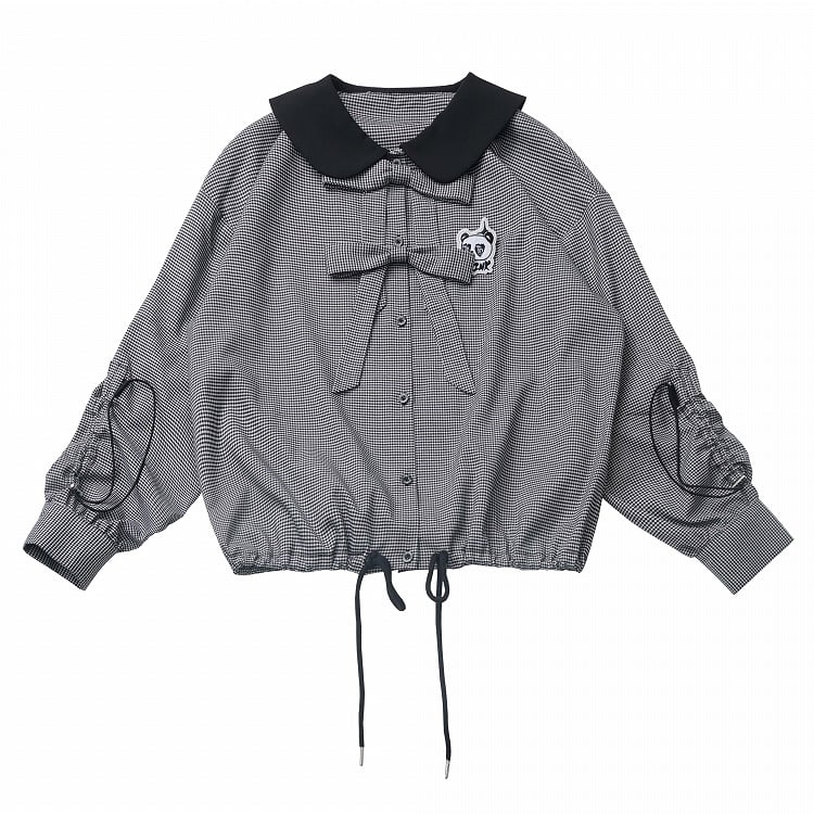 Diese schwarz-weiß karierte Bluse besticht durch einen süßen Peter-Pan-Kragen und charmante Schleifenakzente an den Manschetten. Der Kordelzug verleiht diesem bezaubernden Stück einen Hauch von Vielseitigkeit. Diese Bluse ist die perfekte Ergänzung für jede Garderobe und wertet Ihren Stil mit ihrem süßen und liebenswerten Design auf.