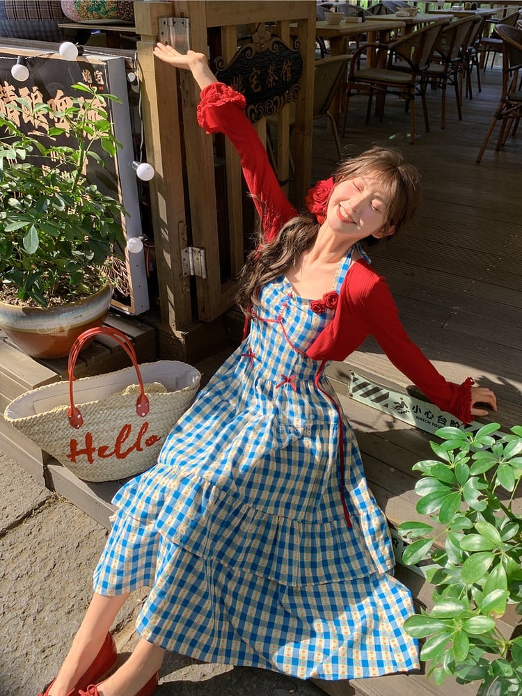 Süßes blaues, kariertes Neckholder-Ferienkleid mit Blumenmuster