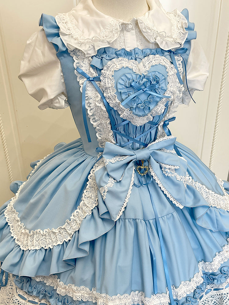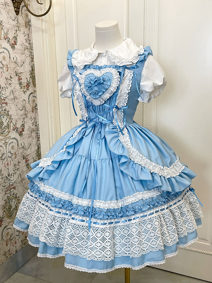 Blaues Old School Lolita-Kleid, abnehmbarer, gepolsterter Pulloverrock mit Herz-Mieder