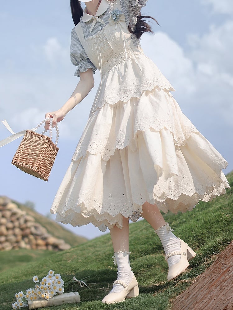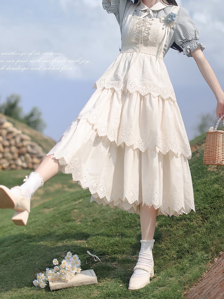 Blau-weißes Old School Lolita Fashion Kleid mit Schleife und Details, JSK-Set