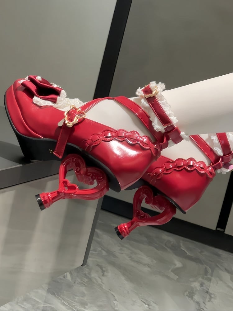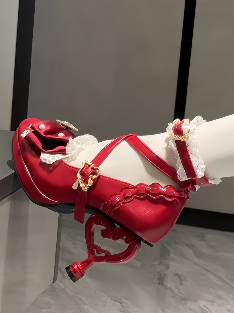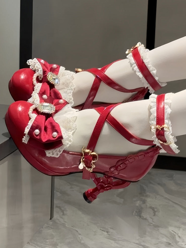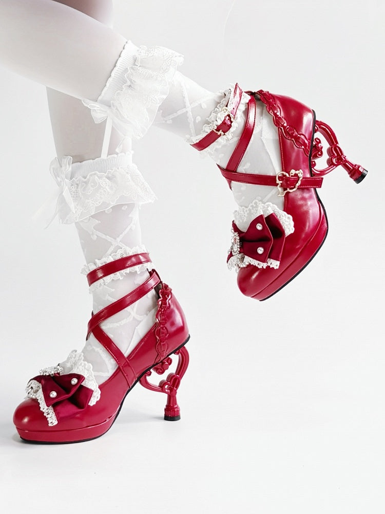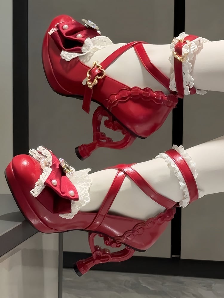 Embellished Bow with Beads, Delicate Lace & Heart Shaped Heel Wine Red Hime Lolita High Heels