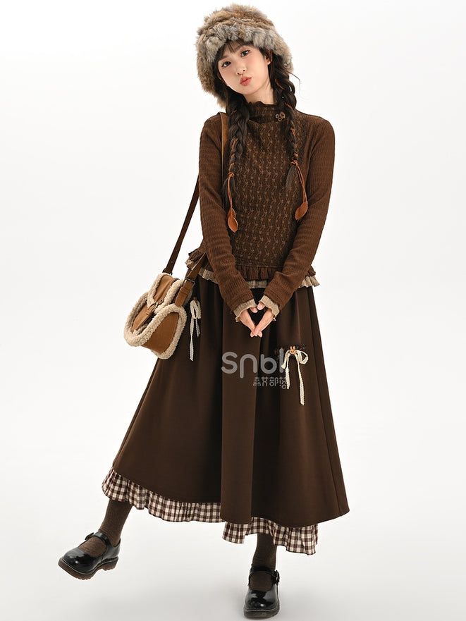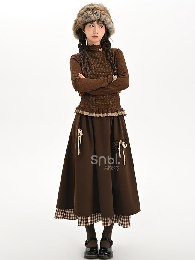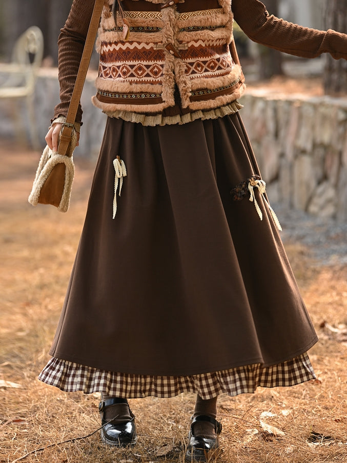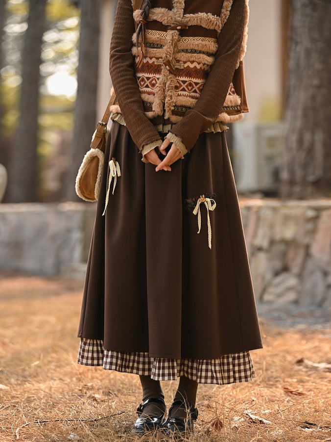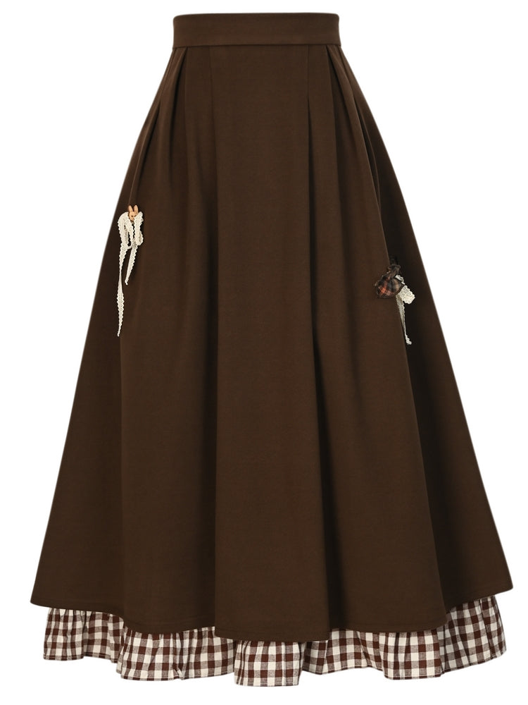 Brauner Rock mit Schleifendetails und knöchellangem Rock mit kariertem Rüschensaum