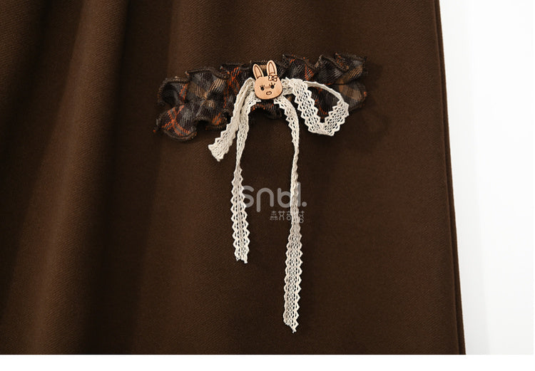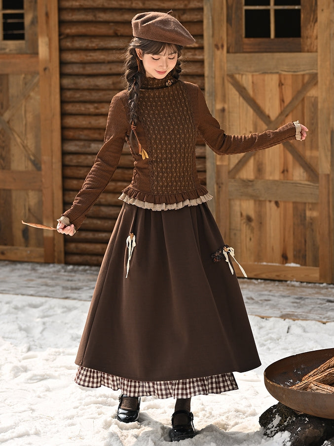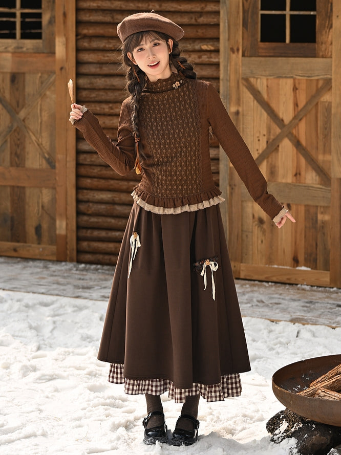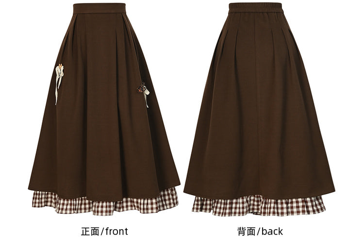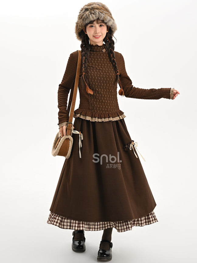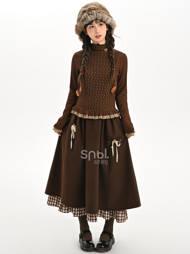 Brauner Rock mit Schleifendetails und knöchellangem Rock mit kariertem Rüschensaum