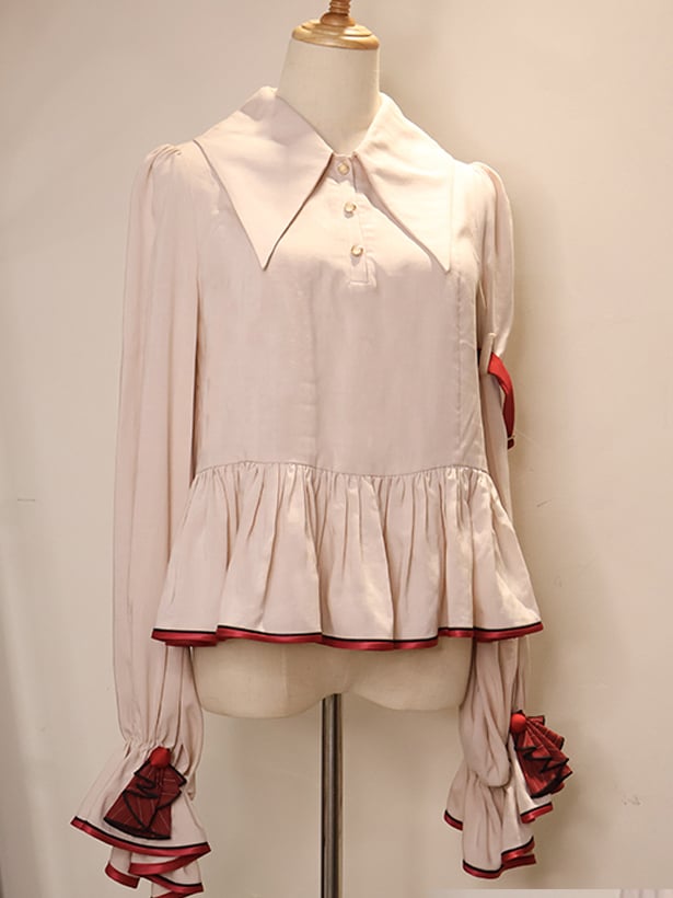 Beiges Hemd mit kontrastierendem roten Besatz und Volantsaum