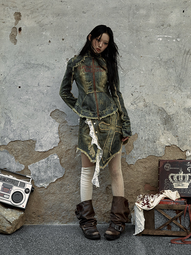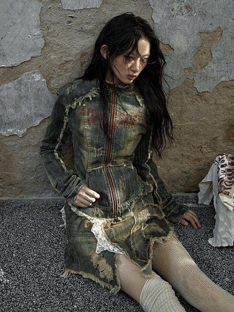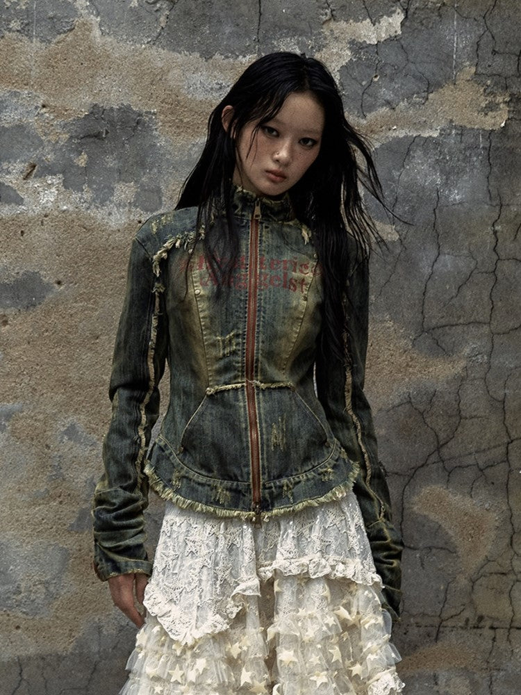 Punk Rock Washed Blue Denim Distress Trim Jacket with Cross Patch & Red Letter Print