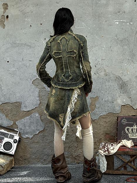 Distress with Denim Cross Red Rock Letter Blue Trim Punk Jacket Washed Patch Print