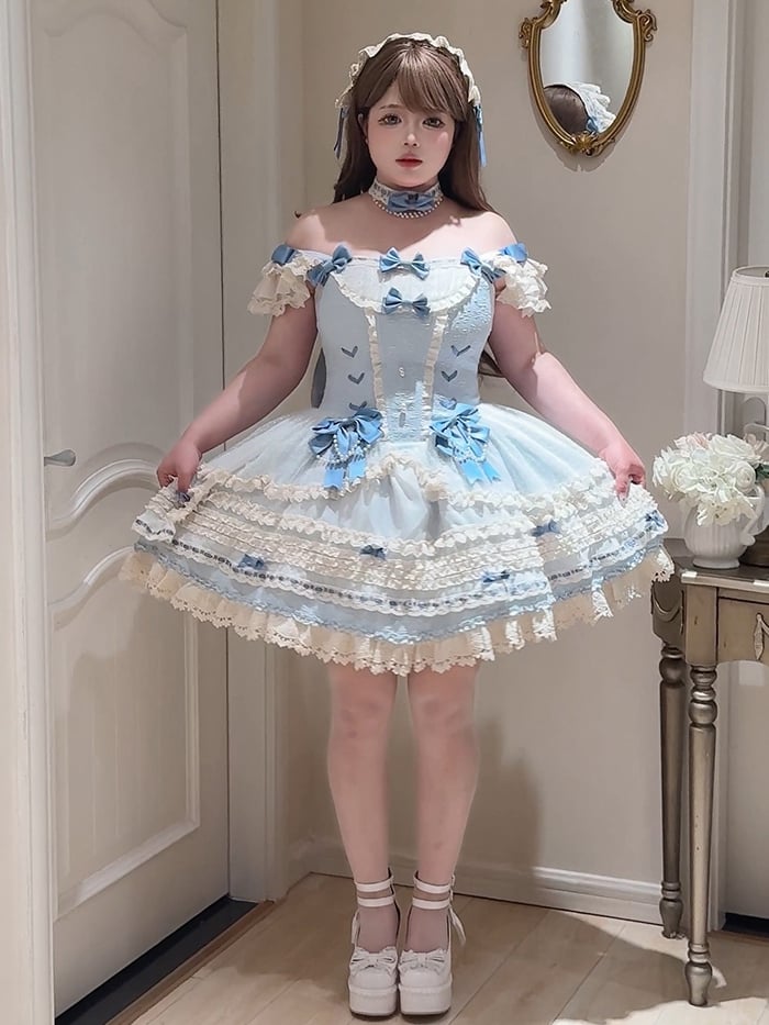 Kleid mit Stäbchen, Lolita, blauer Rock, Pullover, Taillenakzente, Ballercore-Schleife