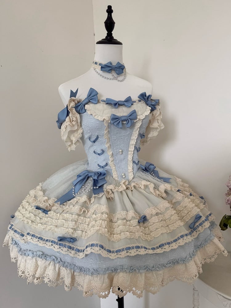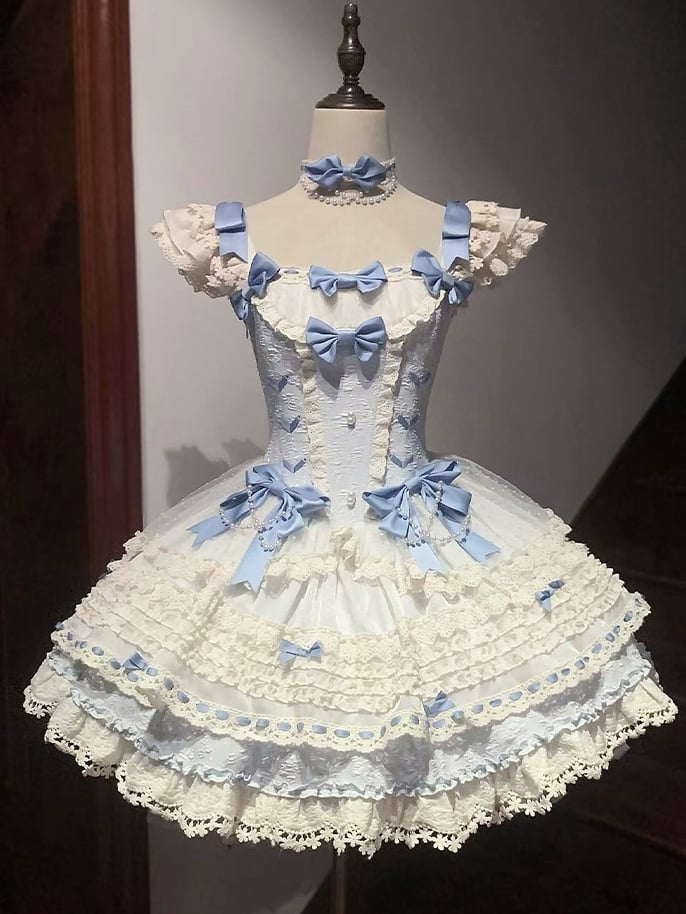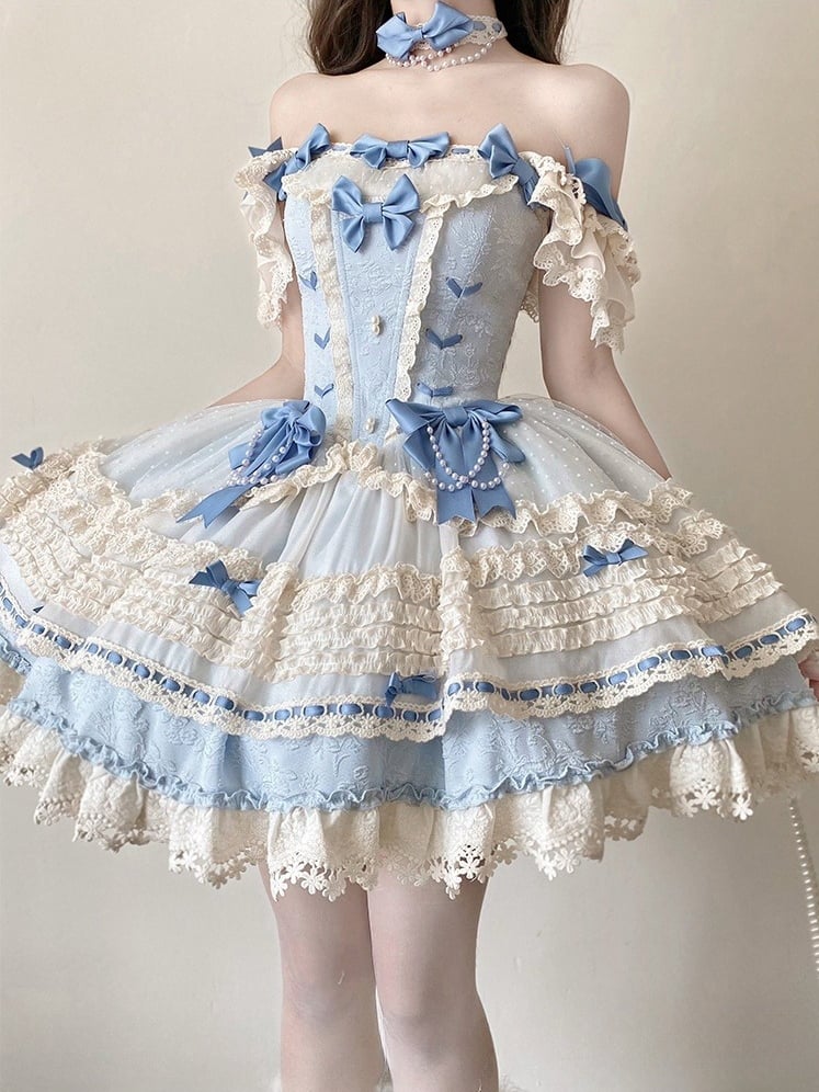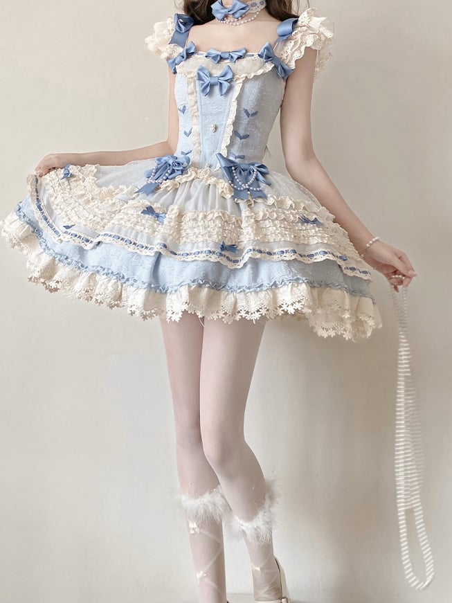 Blaues Ballercore-Kleid mit Schleifenakzenten und entbeinter Taille, Lolita-Pulloverrock