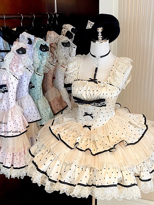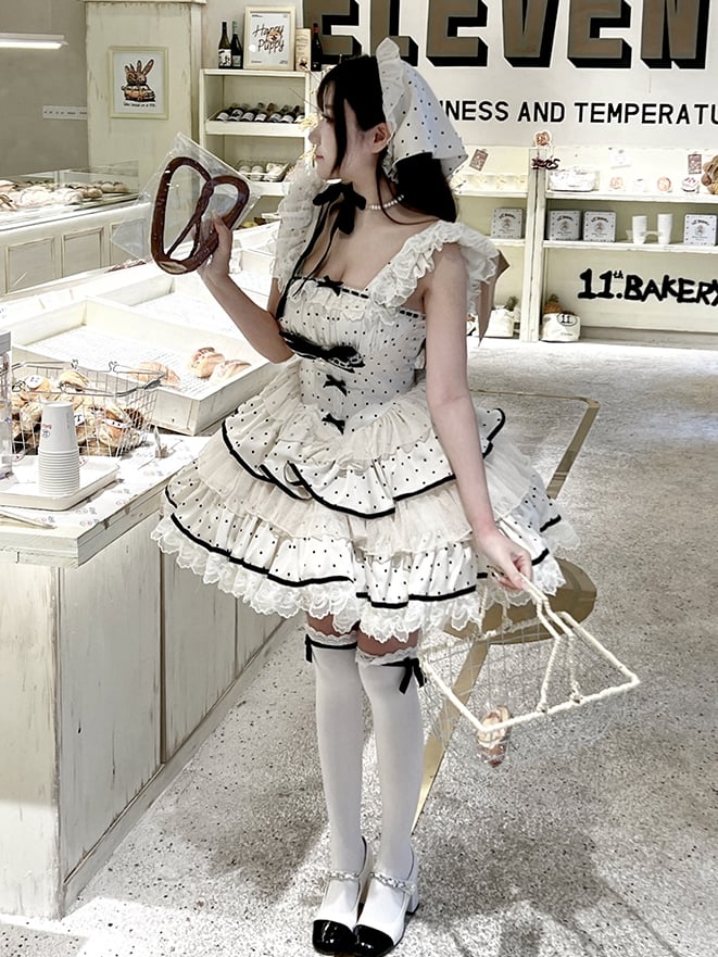 Schwarze Punkte Beige Basken-Taille Stufenrock Süßes Kleid