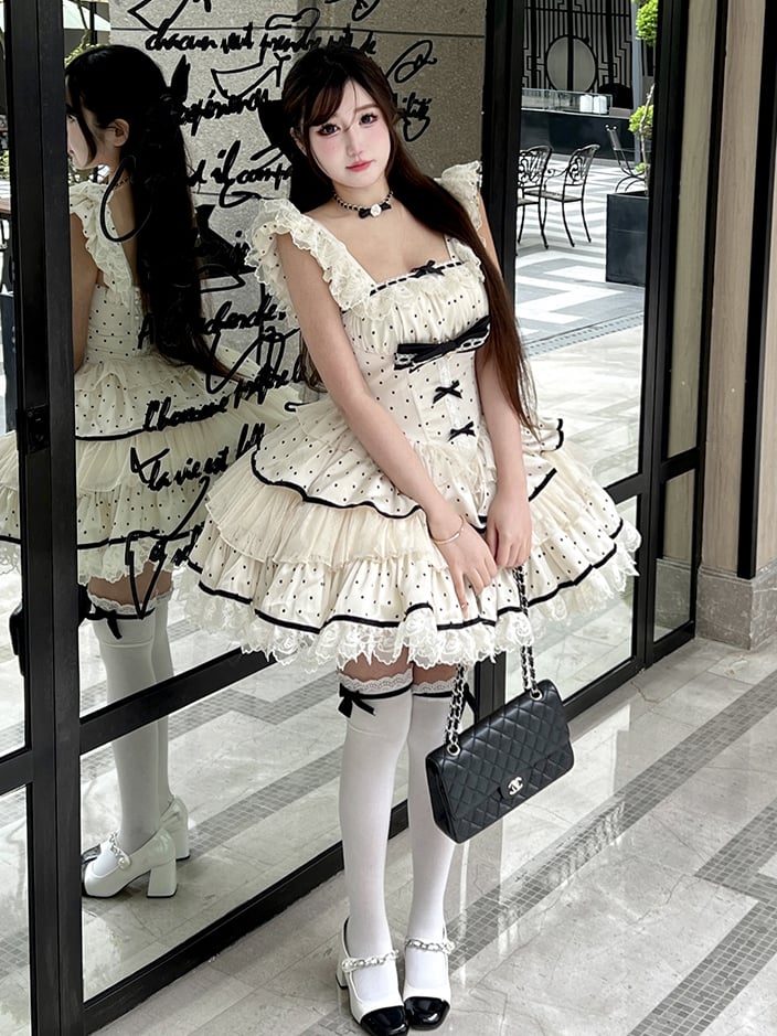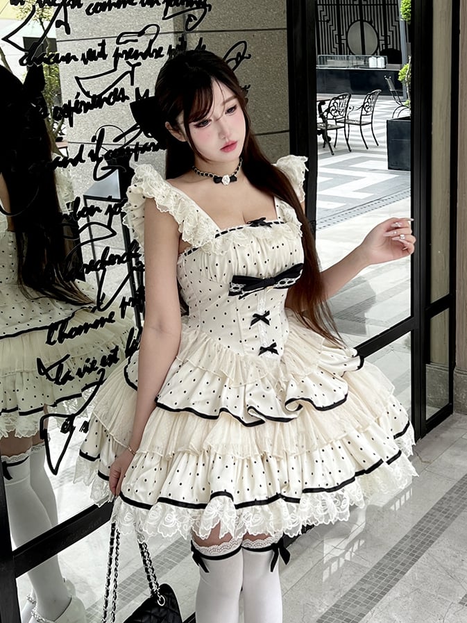 Kleid Polka Sweet Tiered Dots Beige Rock Taille Baskisch Schwarz