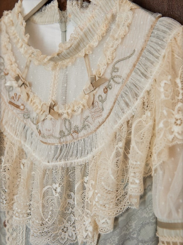 Green Bear Printed Lace-Trimmed Sweet Lolita Dress with Bow Accents