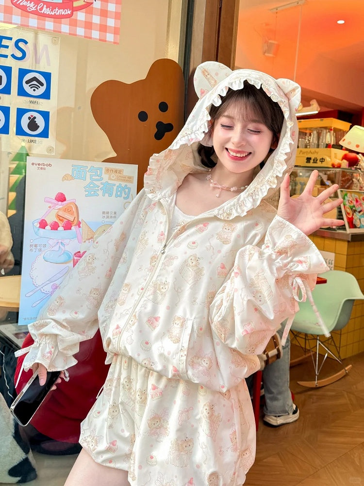 Ohren Kapuze Beige Allover Kordelzug Kitty Print Sonnenschutz Jacke Bündchen Kitty