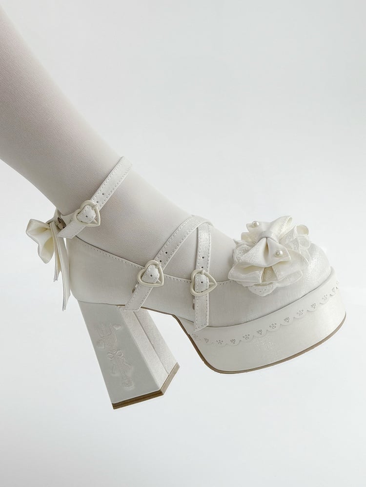 Weiße Lolita-Absätze mit hoher Spitze und Stickerei und Schleife