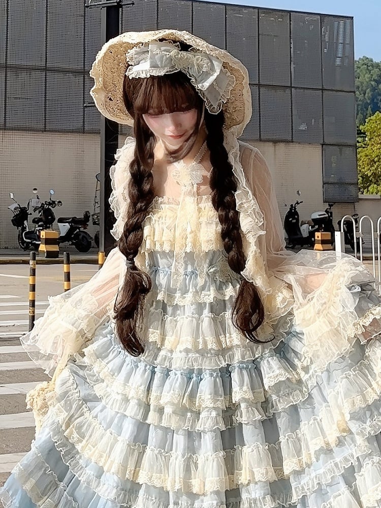Blau-weißes Old School Lolita Fashion Kleid mit Schleife und Details, JSK-Set