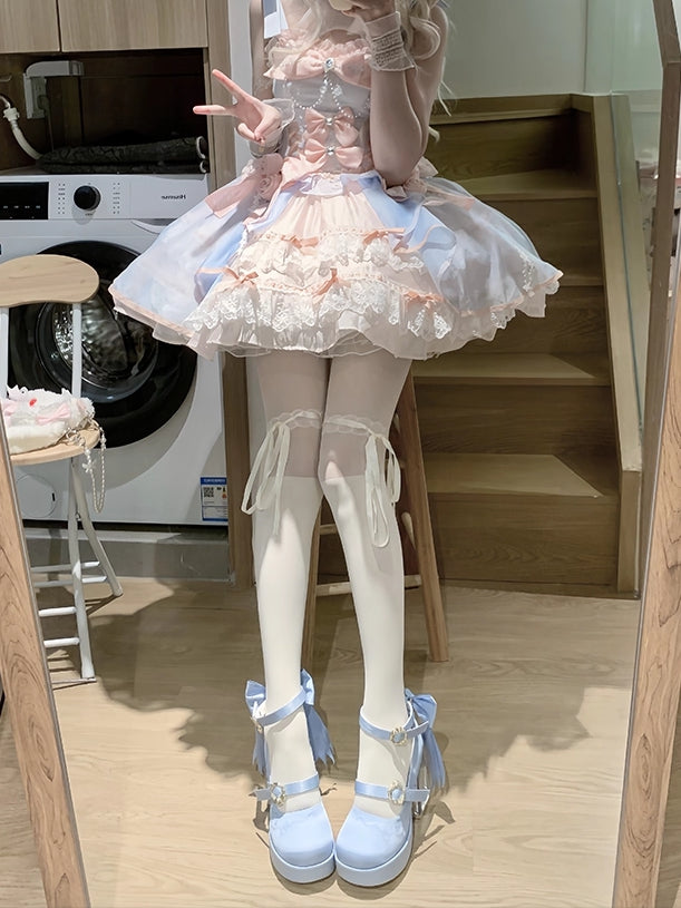 Satin Blue Platform High-heel Mary Janes - Transparent Heel with Goldfish Charm, Detachable Bow & Wave Embroidery