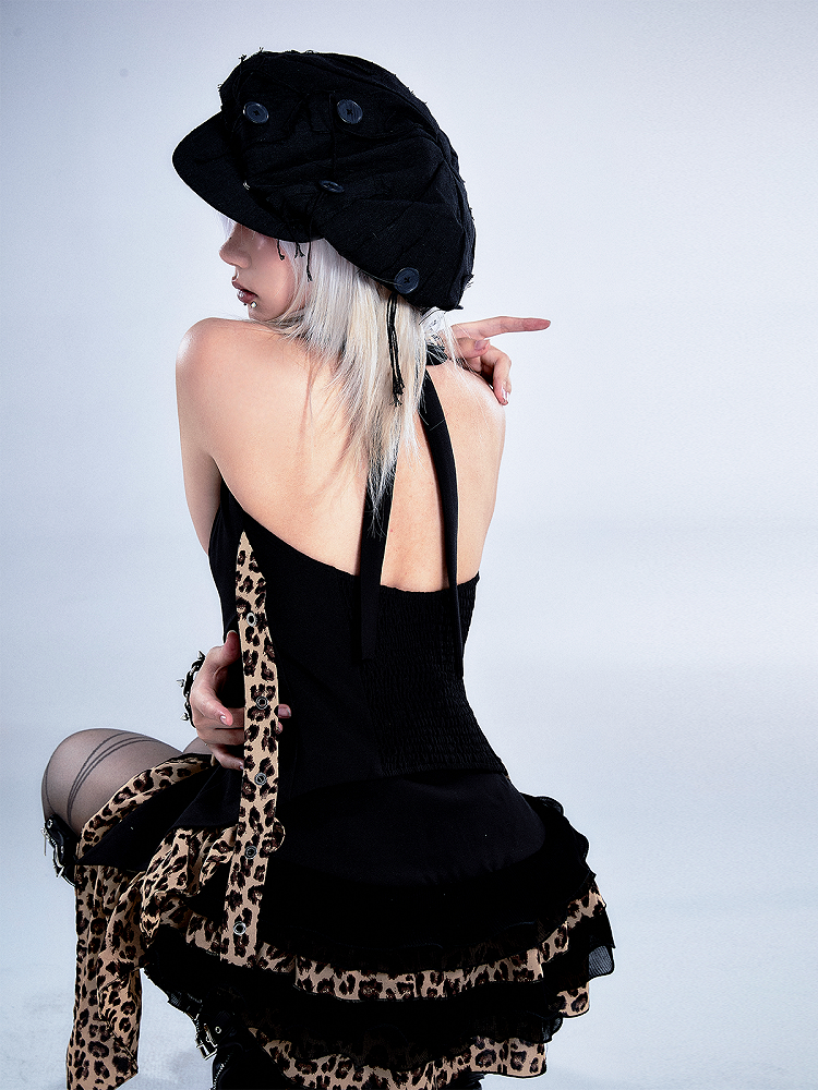 Schwarzes Neckholder-Top mit Vintage-Leopardenmuster und gerüschtem asymmetrischem Saum