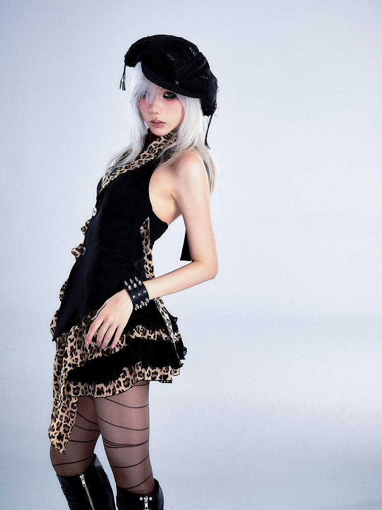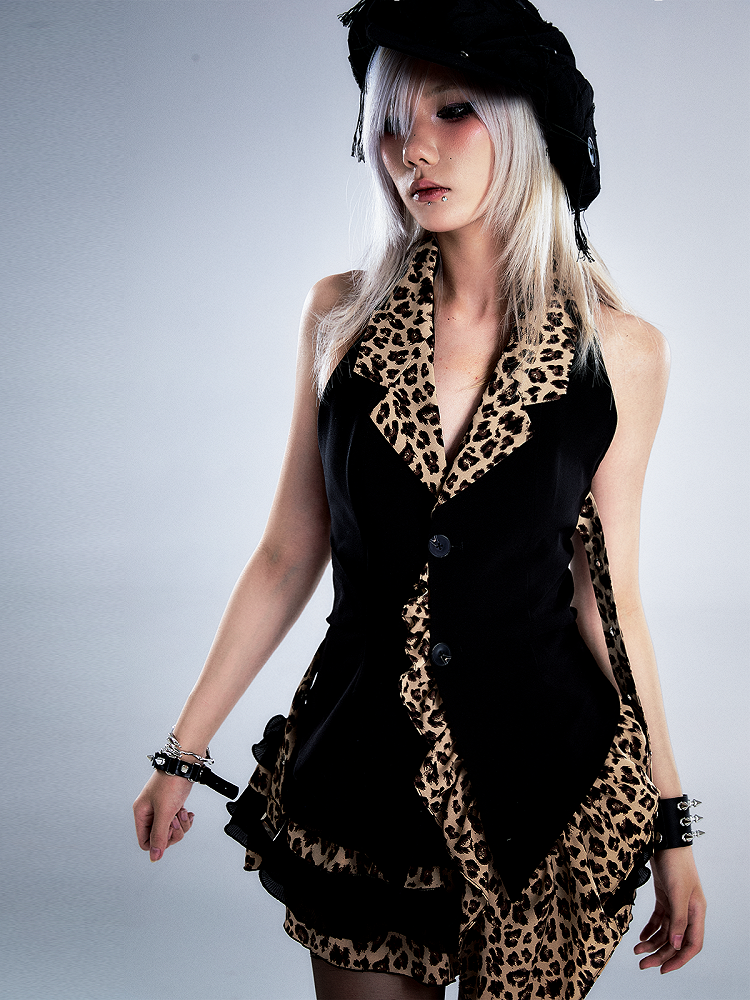 Saum Schwarz Print Asymmetrisch mit Leopard Top Neckholder Rüschen Hals Vintage