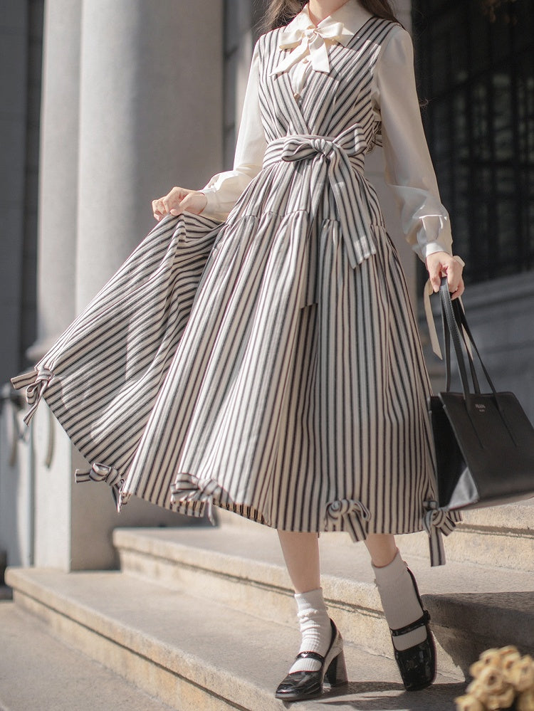 Elegantes Preppy-Kleid in Schwarz und Weiß gestreift mit Taillengürtel und Schleifendetails am Saum