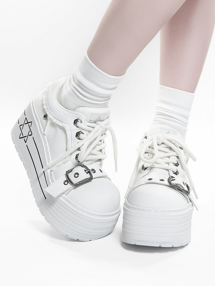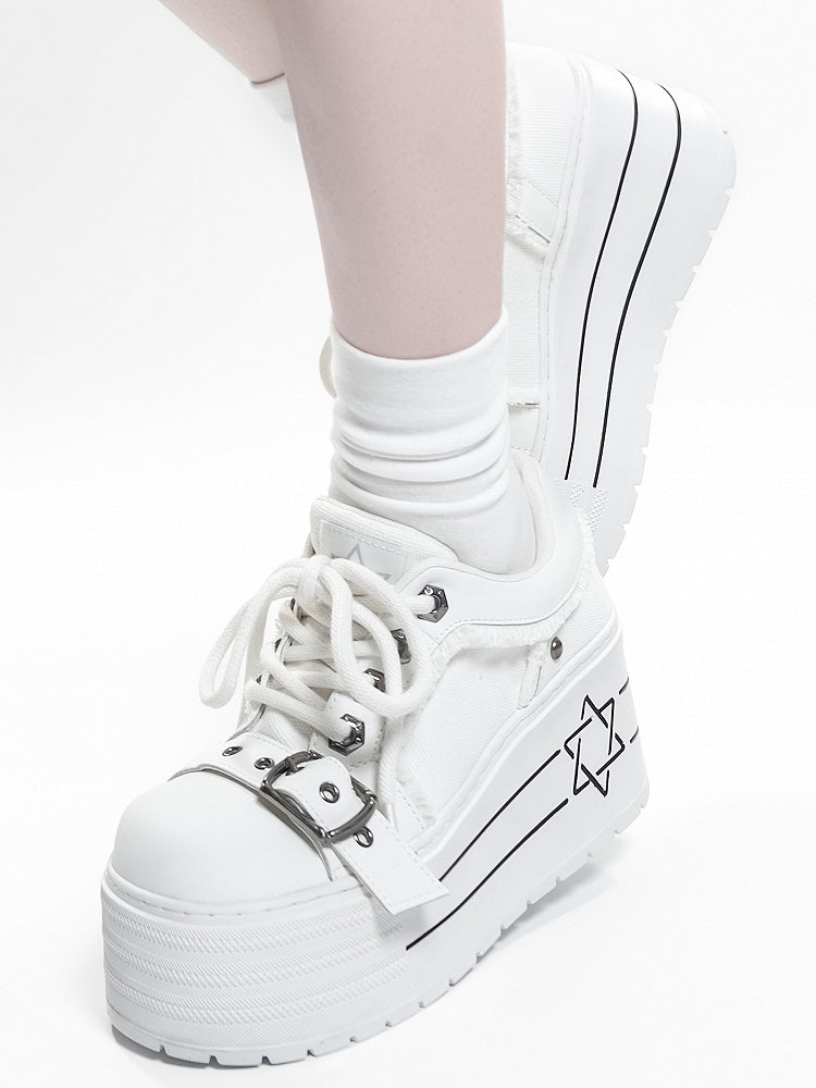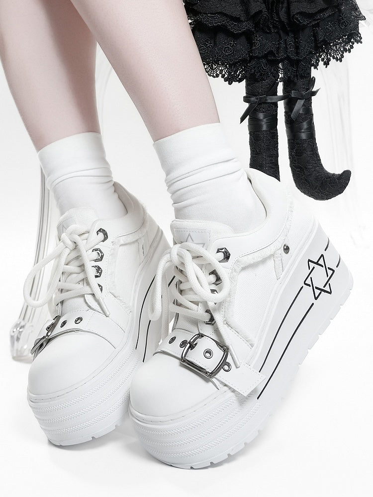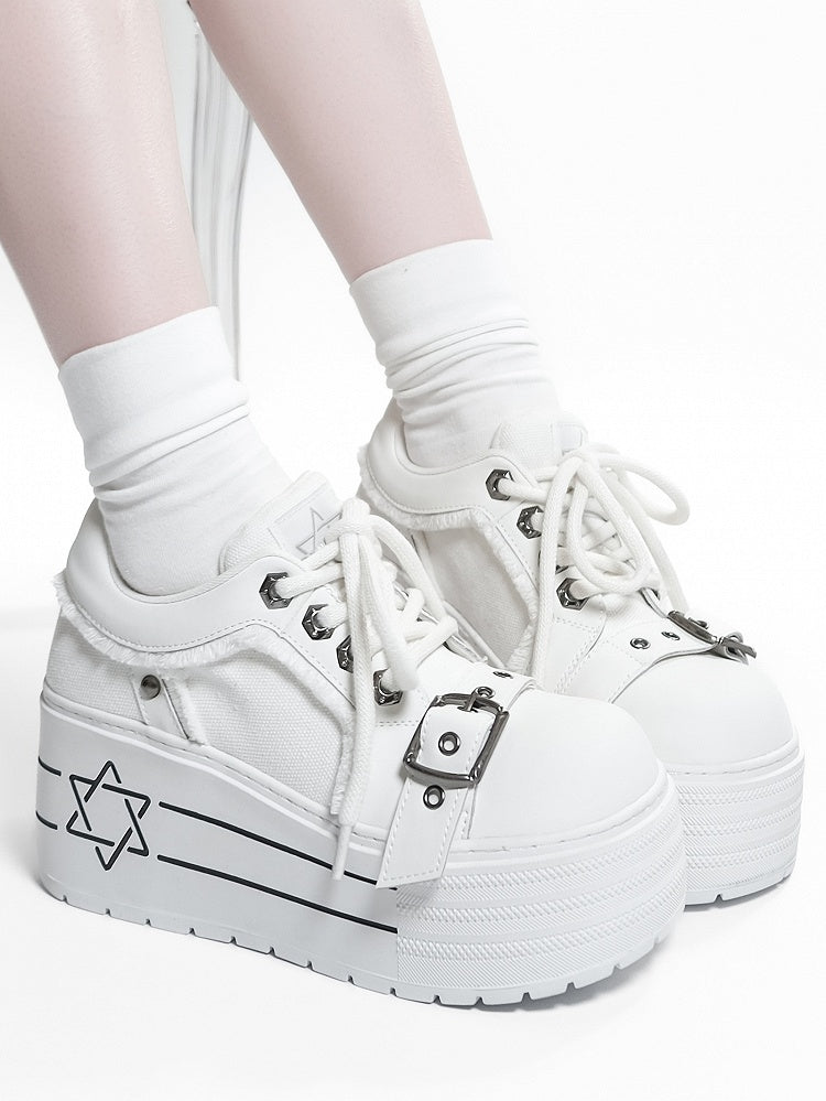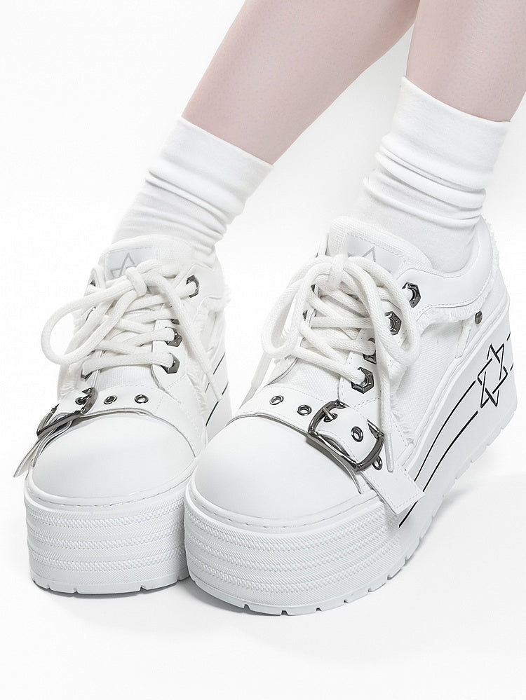 Hexagram Details, Buckle Decor & Raw Edge with Lace Fastening Punk White Platforms