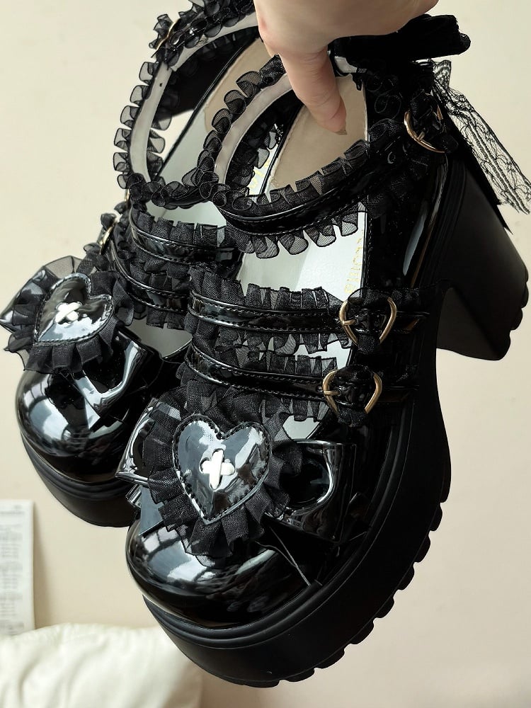 Schwarze Plateauschuhe aus PU-Leder mit hohem Blockabsatz – Jirai Kei-Stil, gerüschten Spitzenriemen und Schleifenakzenten