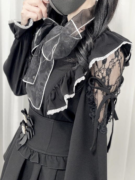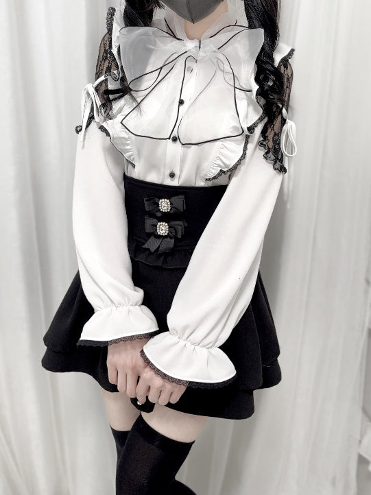 Jirai Kei Schwarz/Weiß/Dusty Cutout Schulter Bluse Schleife Ausschnitt Big Pink