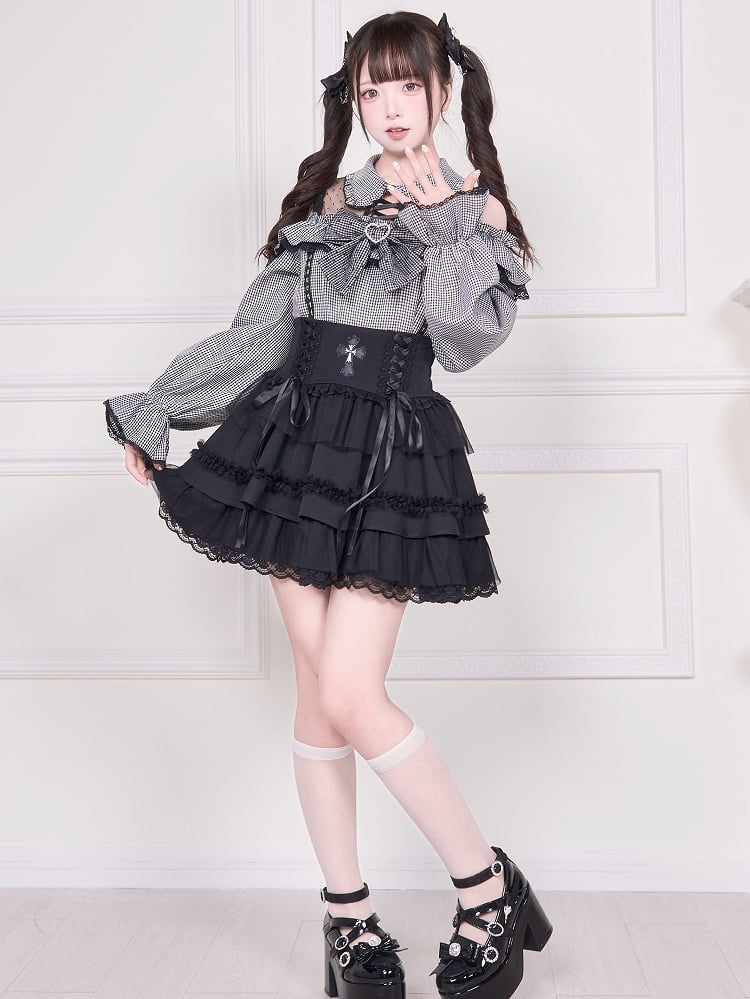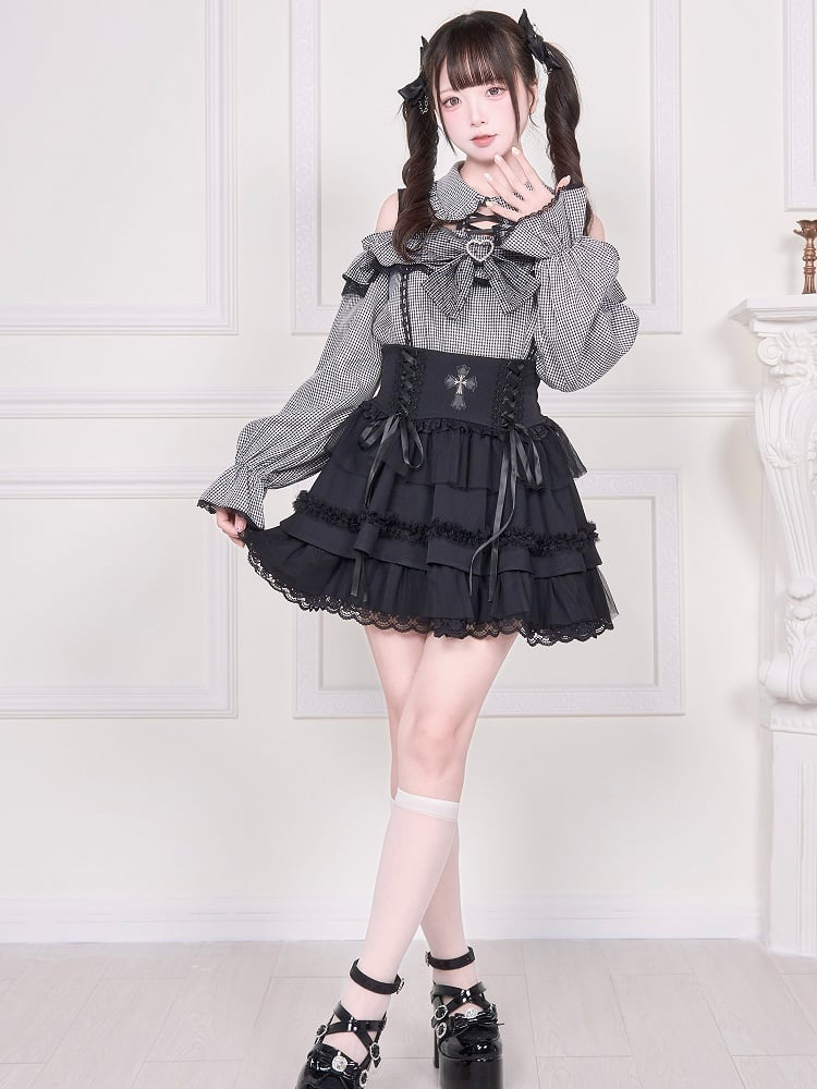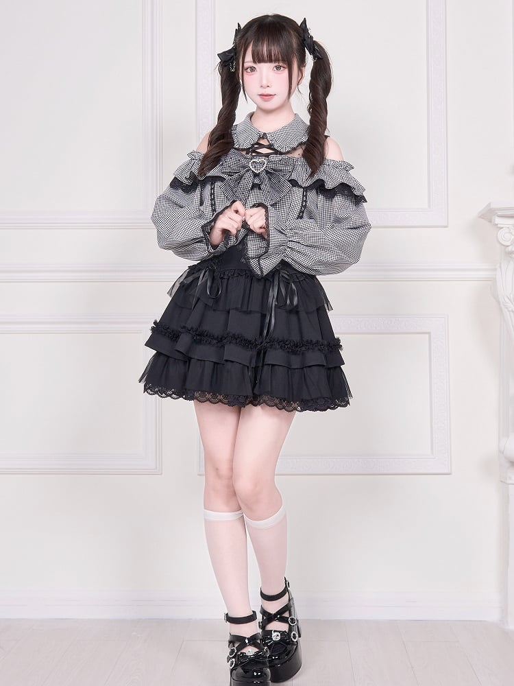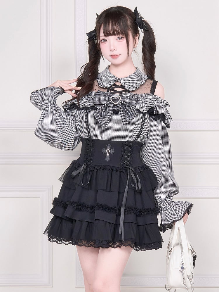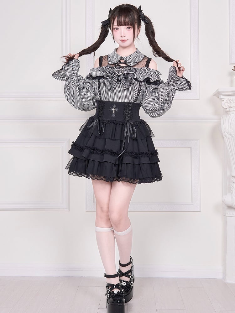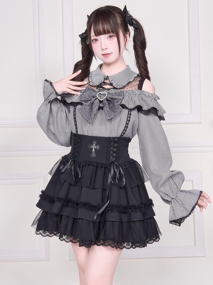Jirai Kei – Langärmlige, karierte Bluse mit Illusionsausschnitt und ausgeschnittener Schulter