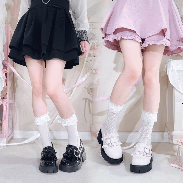 Jirai Kei – Loafer in Schwarz mit 6,5 cm Absatz und dicker Plateausohle und Herzausschnitt mit Perlenverzierung