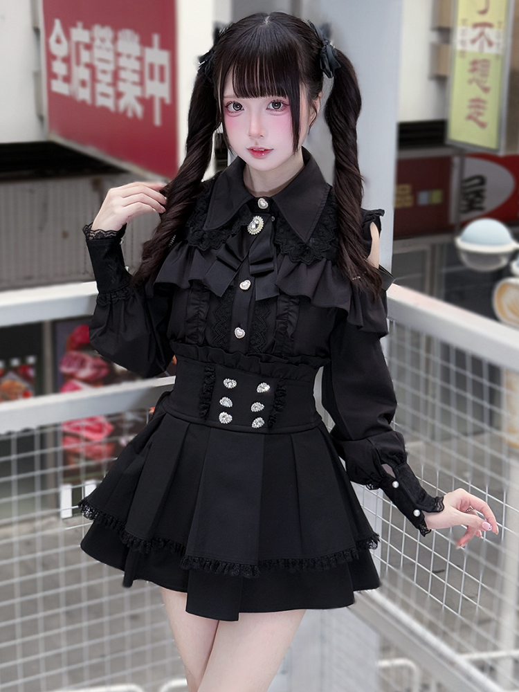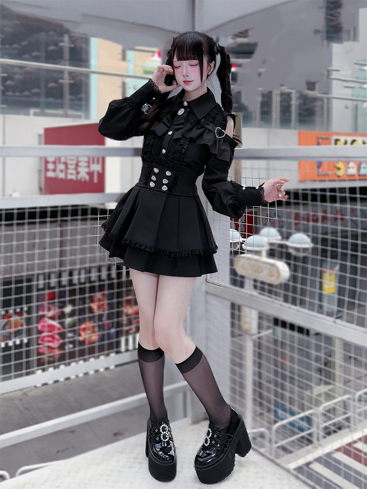 Kei Look Blouse Buckle Cutout Black Shoulder Heart Decorative with | Jirai
