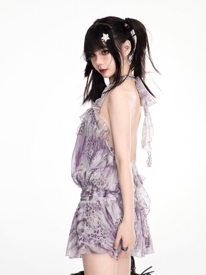 Lavendelfarbenes Leopardenmuster Gyaru Fashion Neckholder-Kleid aus Chiffon mit kaskadierenden Rüschen und rückenfreiem Schnitt