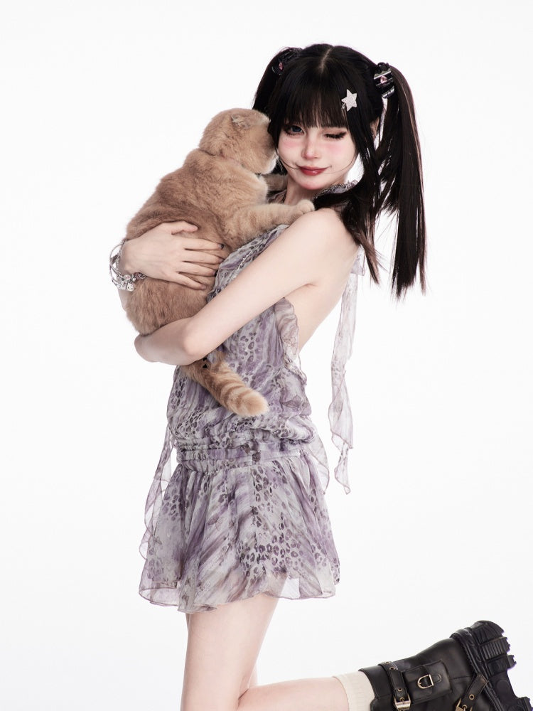 Gyaru Fashion Lavendel Leopardenmuster Kaskadenrüschen Chiffon Neckholder Rückenfreies Kleid