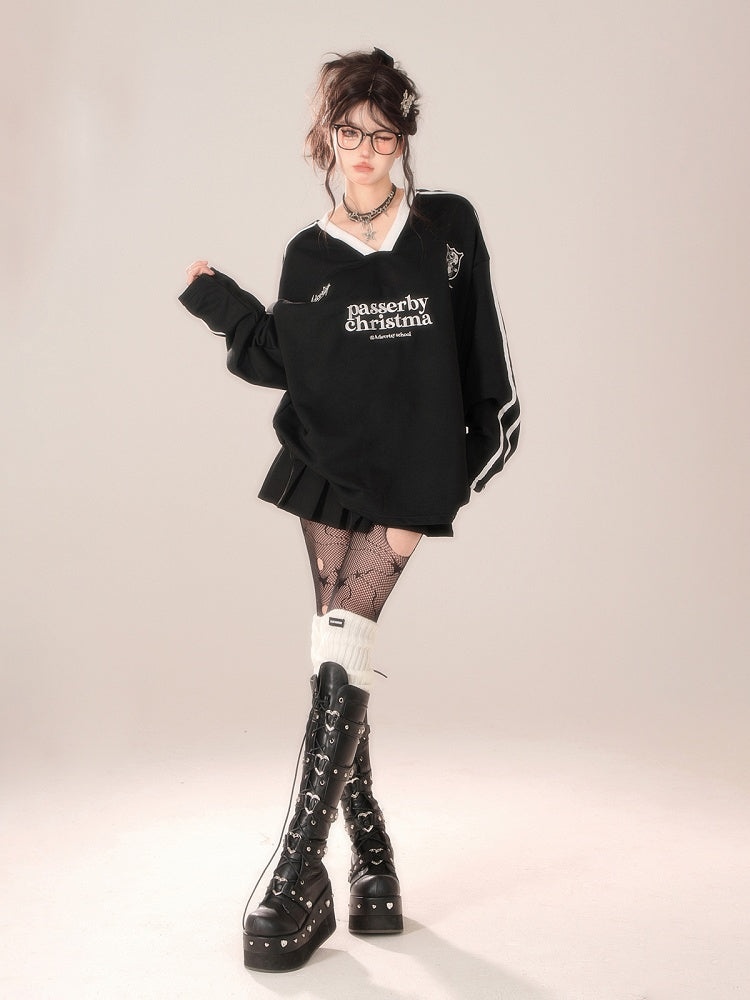Preppy Black V-Neck Long Sleeve Top - Lettering & Striped Accents