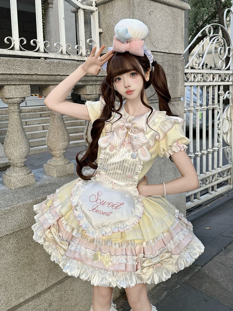 Gelbes und rosa Lolita-Kleid mit süßen Häschenmotiven und Puffärmeln