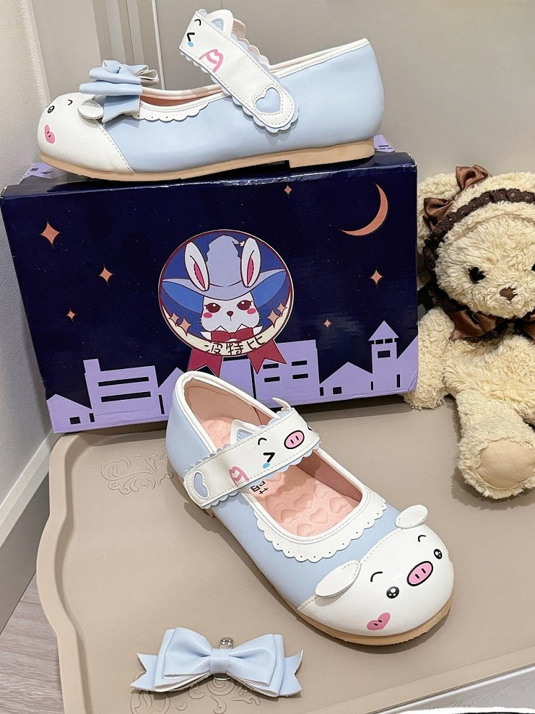 Sweet Blue Lolita Shoes - PU Leather with Scalloped Hem, Detachable Bow & Piggy Design