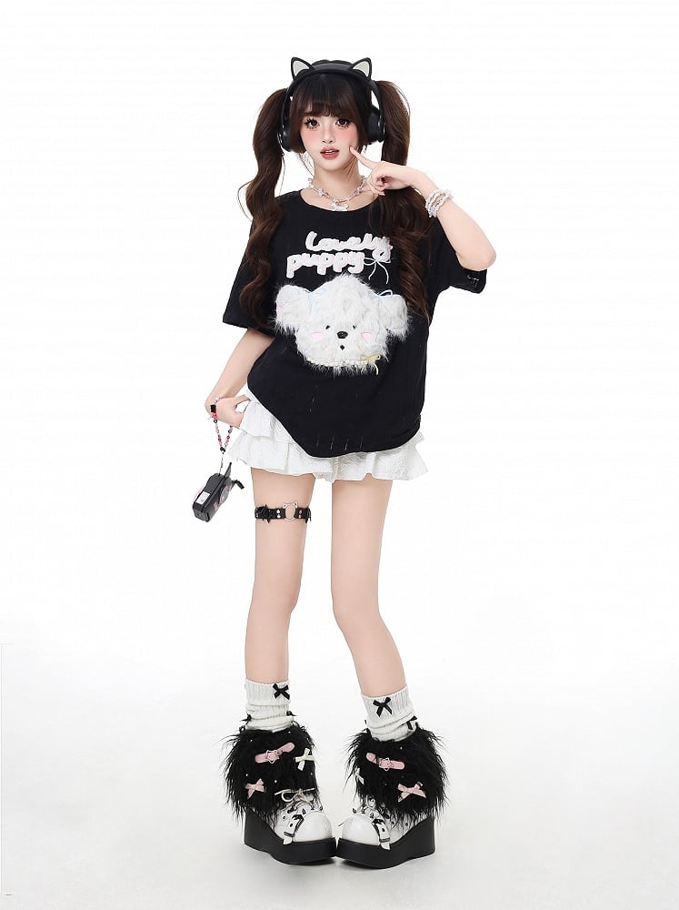 Lockeres, entzückendes Plüschwelpen-T-Shirt in Schwarz/Hellblau mit Rundhalsausschnitt