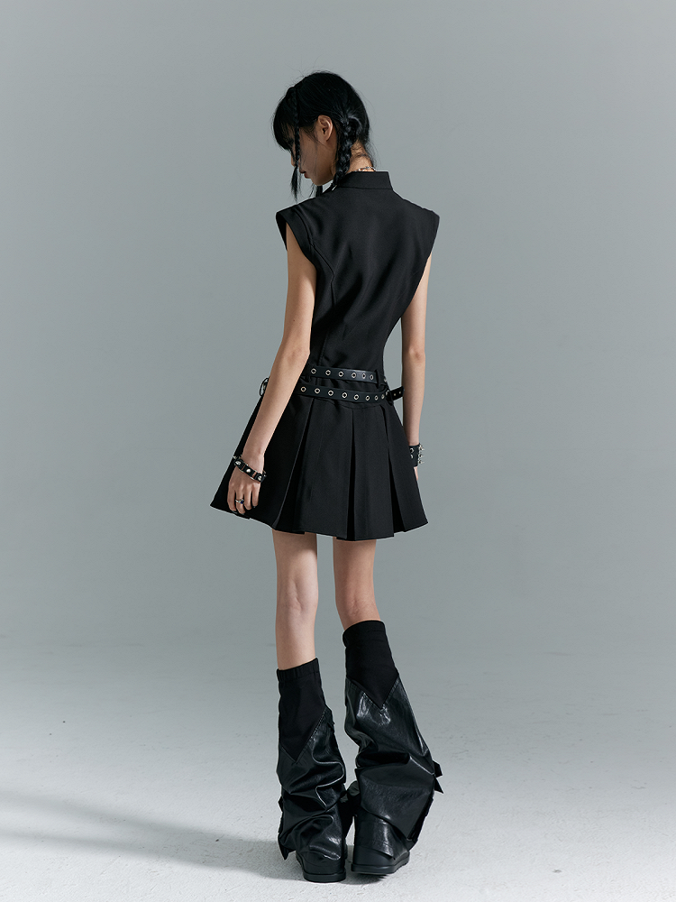 Schwarzes Cheongsam-A-Linien-Punkkleid mit Metallakzenten und Ausschnitt
