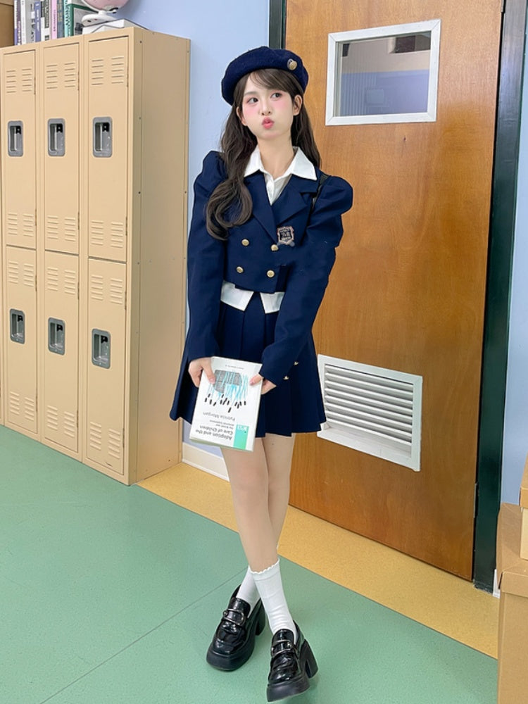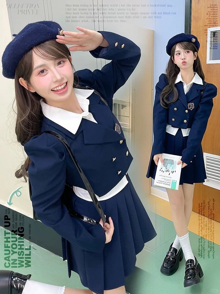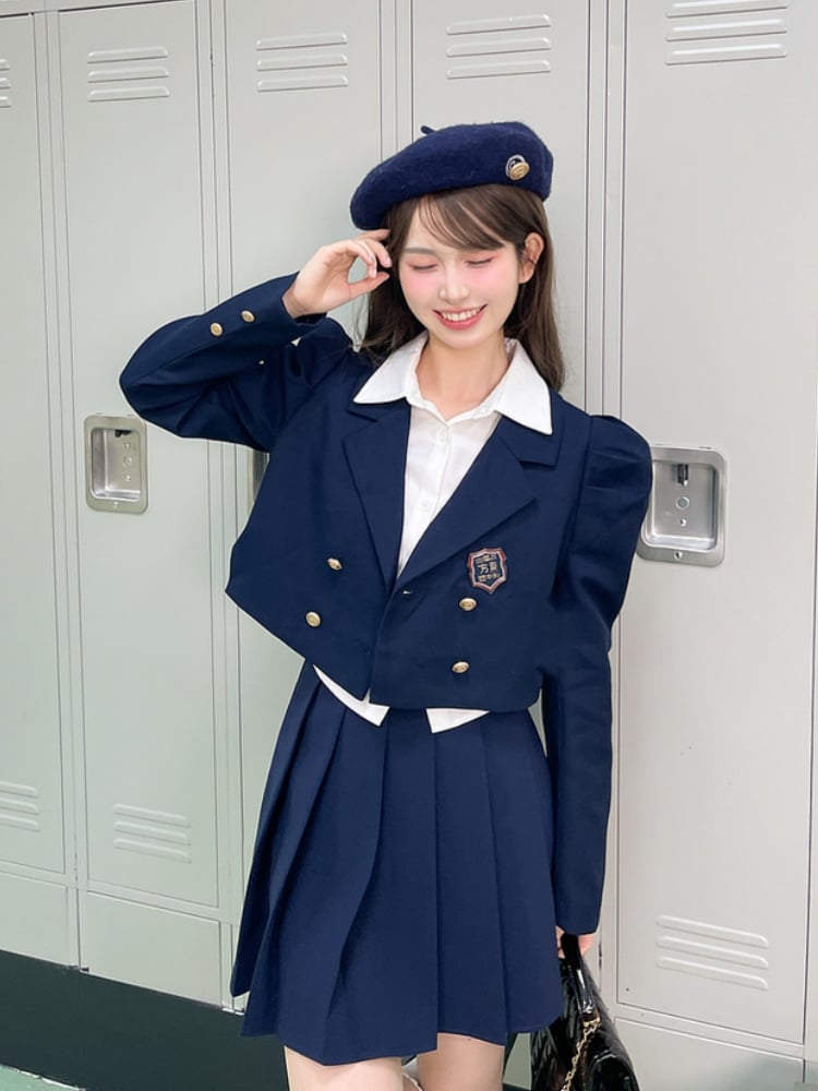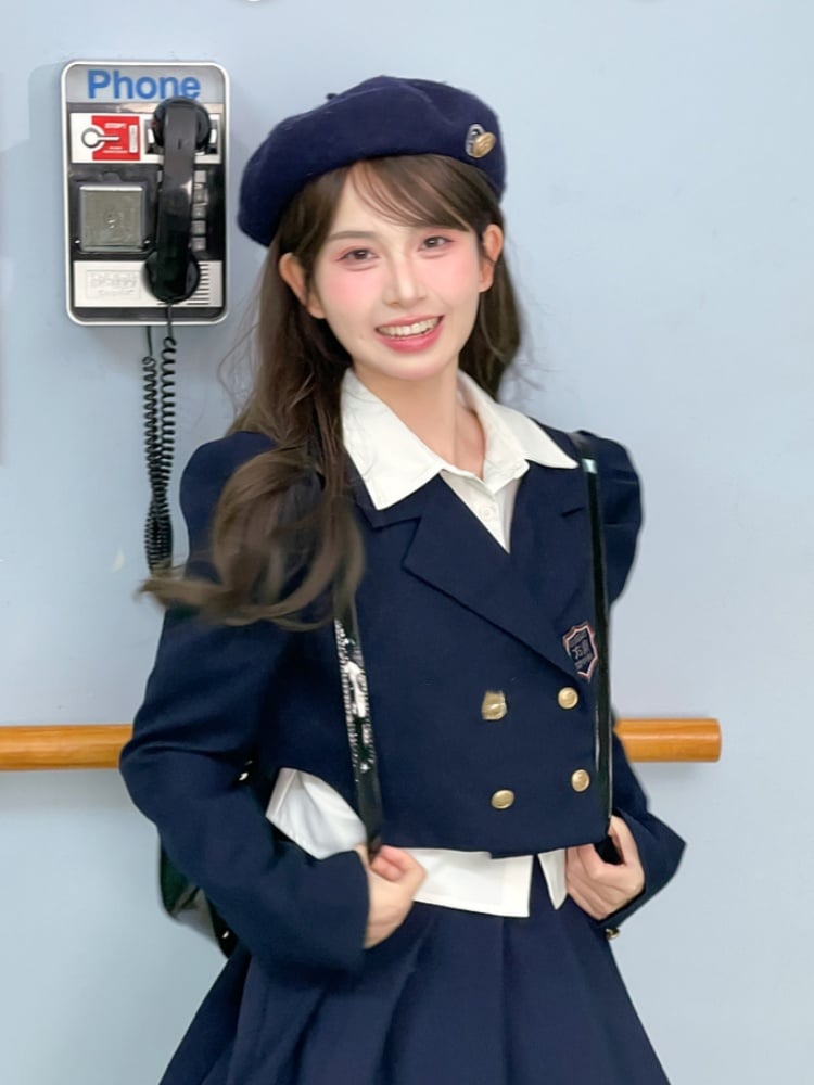 Verleihen Sie Ihrer Garderobe einen Hauch von Eleganz mit unserem marineblauen JK-Crop-Blazer mit Reverskragen und goldfarbenen Knöpfen. Die goldfarbenen Knöpfe und das kurze Design verleihen Ihnen einen eleganten und süßen Look. Perfekt für jeden Anlass.