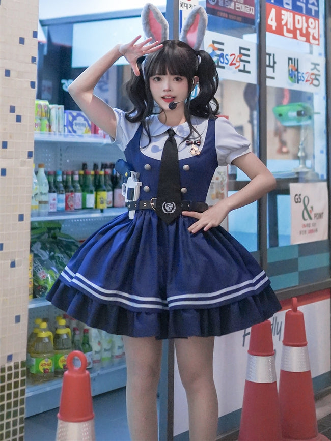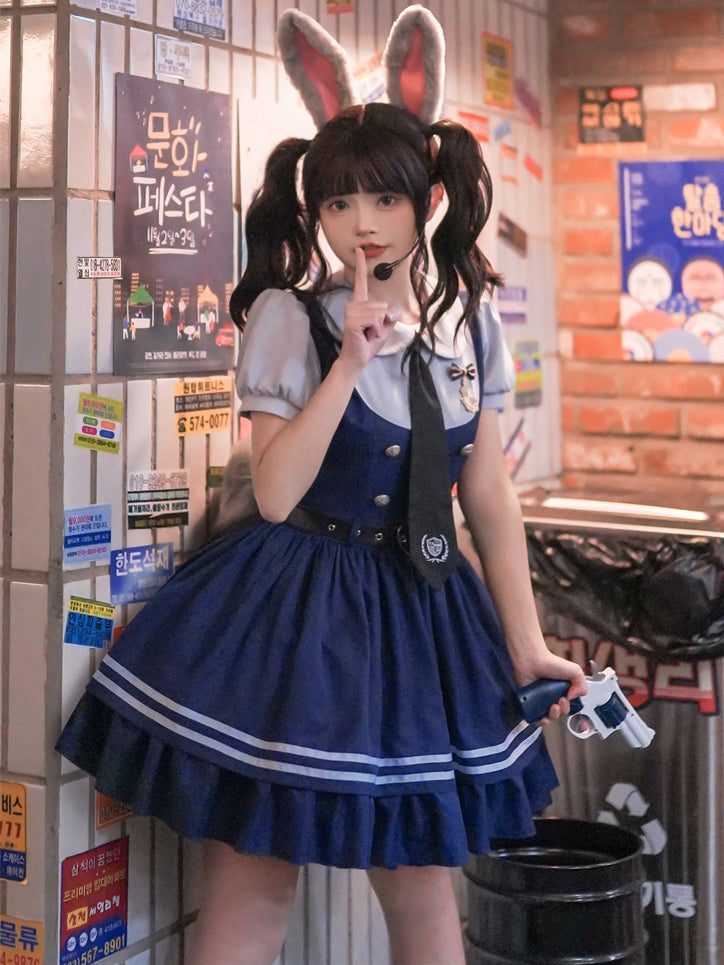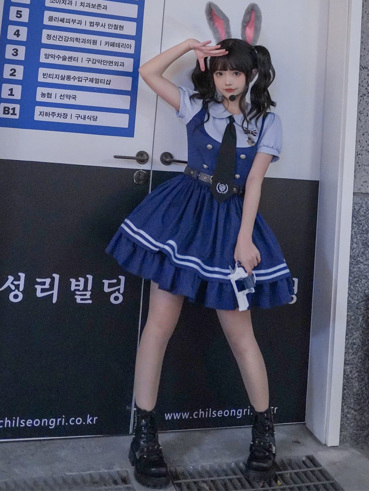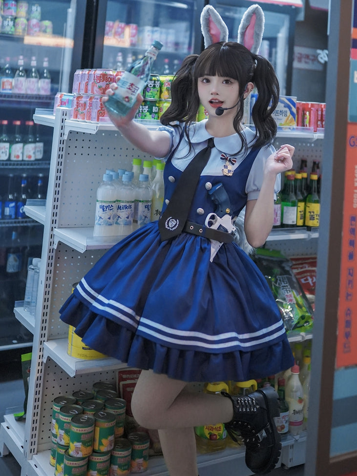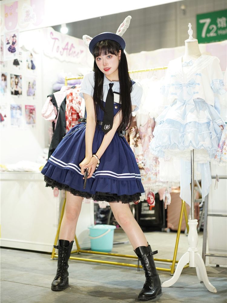 Blau-weißes Old School Lolita Fashion Kleid mit Schleife und Details, JSK-Set