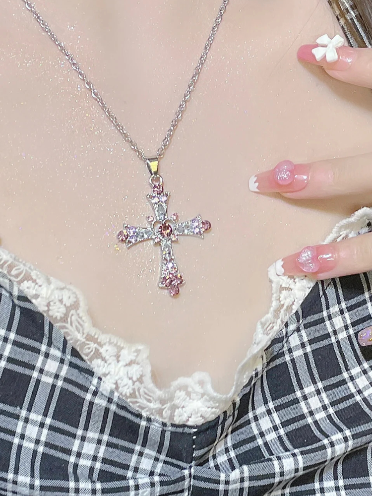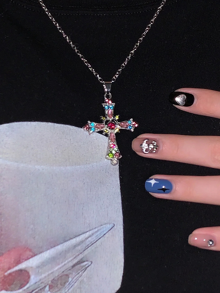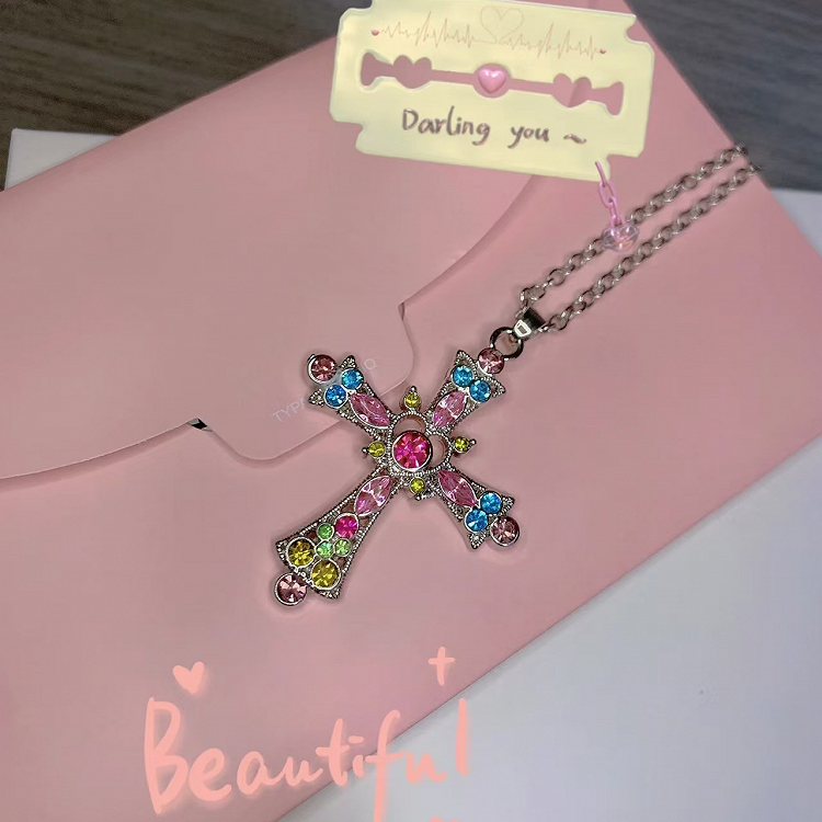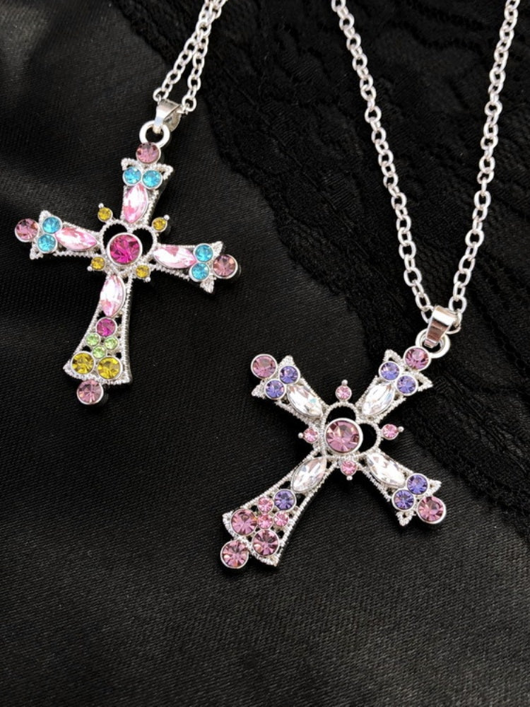 Verleihen Sie Ihrem Outfit mit unserer Halskette mit neonfarbenem Regenbogen-/Lila-Strass-Kreuzanhänger einen süßen Touch. Die wunderschönen Farben und funkelnden Strasssteine lassen Sie aus der Menge hervorstechen. Perfekt, um Ihrem Stil einen Hauch von Charme zu verleihen.
