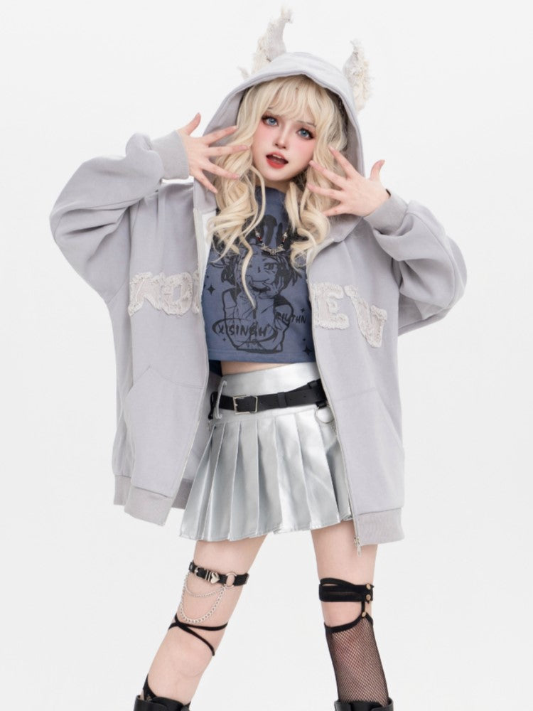 Hellgrauer Kapuzenpullover ohne Fleece mit Welpenohren, Welpenaufdruck und Buchstabenapplikation