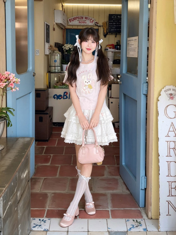Pink Yume Entzückendes T-Shirt mit Hasen-Applikation und Rundhalsausschnitt, Kawaii