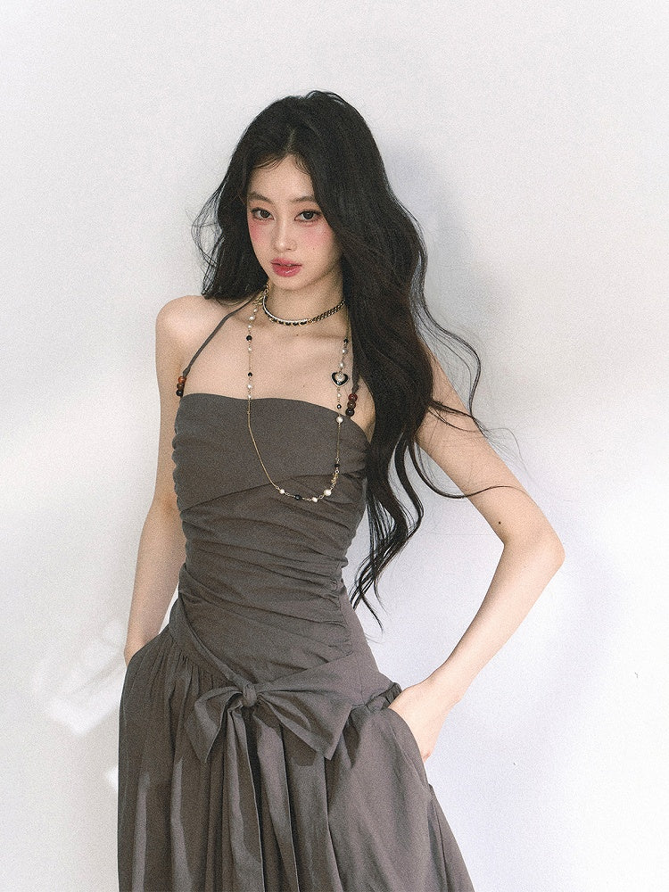 Pink/Graues Neckholderkleid mit Rüschendesign und Schleife zum Selbstbinden