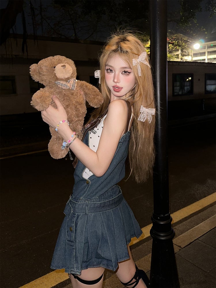 Bittersweet Blue Denim Overall Dress Box Pleat Skirt with Heart-Shaped Buckles