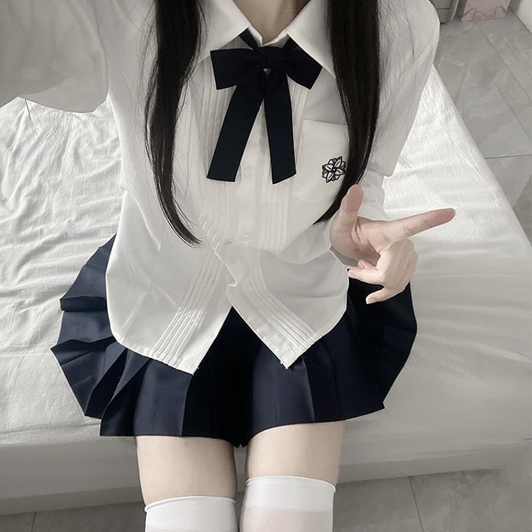 Plissee Shirt Style Details Stickerei Lange Version Preppy Floral Ärmel Weiß